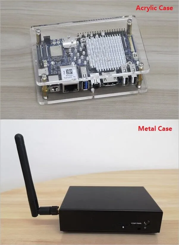 The NanoPC T4 is definitely one of the best high-end SBC (Single board computer) I recently tested and reviewed. With the default acrylic plastic case users may expect partial cover for all the board interfaces. If you need a closed type of case and not a semi-closed acrylic, composed of just two plates I suggest checking FriendlyElec metal priced at $6.99. This cool and well-designed case will not only protect the T4 board from dust and dirt but also assures the heat dispersion will be optimal. Having said that, you are welcome to check more information about this recommended product on the link posted below: