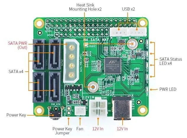 The M4 offers nearly all the necessary features a user could desire, but it unfortunately does not support hard drive interface through SATA. To rectify this limitation, FriendlyElec has ingeniously developed an expansion board equipped with 4x SATA ports. What’s more, this expansion board boasts a power supply powered by a cutting-edge Marvell 88SE9215 chip.