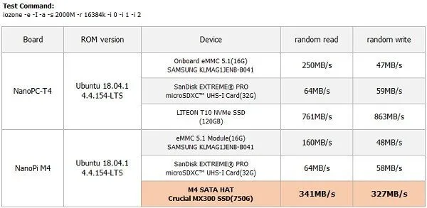 FriendlyElec team performed a series of benchmarking tests under Ubuntu 18.04.x using a Crucial MX300 SSD (750 GB). On paper, the results look very promising and clearly show that the SATA HAT can provide SATA3 read/write speeds.