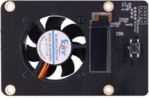 It provides PWM FAN control, IP address info, and other details via the implemented OLED display and a button for selecting and powering the device off. This button can also be assigned to custom functions on request.