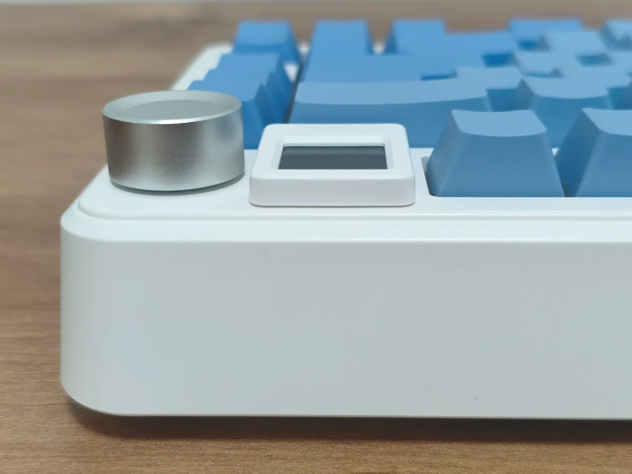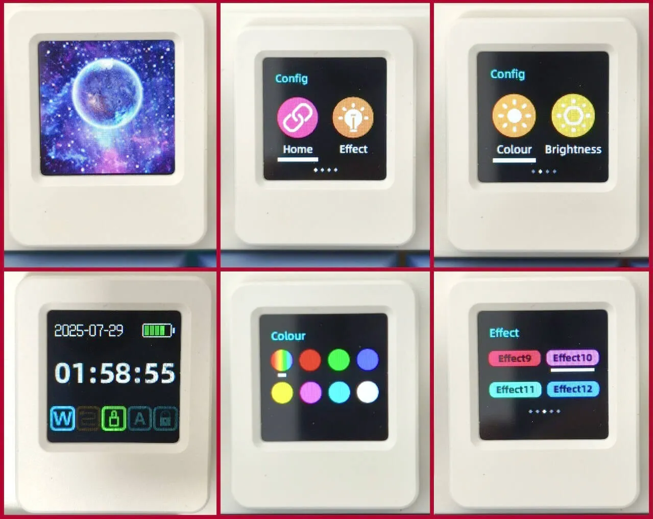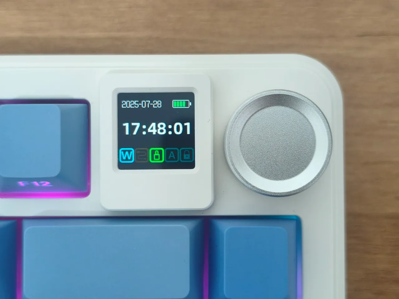 One really awesome feature is that little square screen on the top right corner of the keyboard. It’s about 1.5 cm and not just for show—it actually helps you control all the keyboard settings. You can check the time and date, tweak the brightness of the lights, pick a fun GIF for your background, mess around with different RGB light combinations, switch to your favorite color, change how quickly the lights change, and even see what the battery and volume levels are. Overall, it’s a cool addition to the keyboard, and after messing with it, we can say it works pretty well!