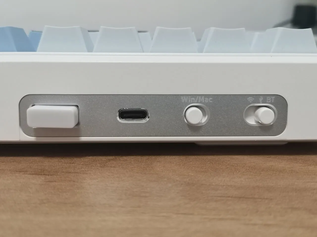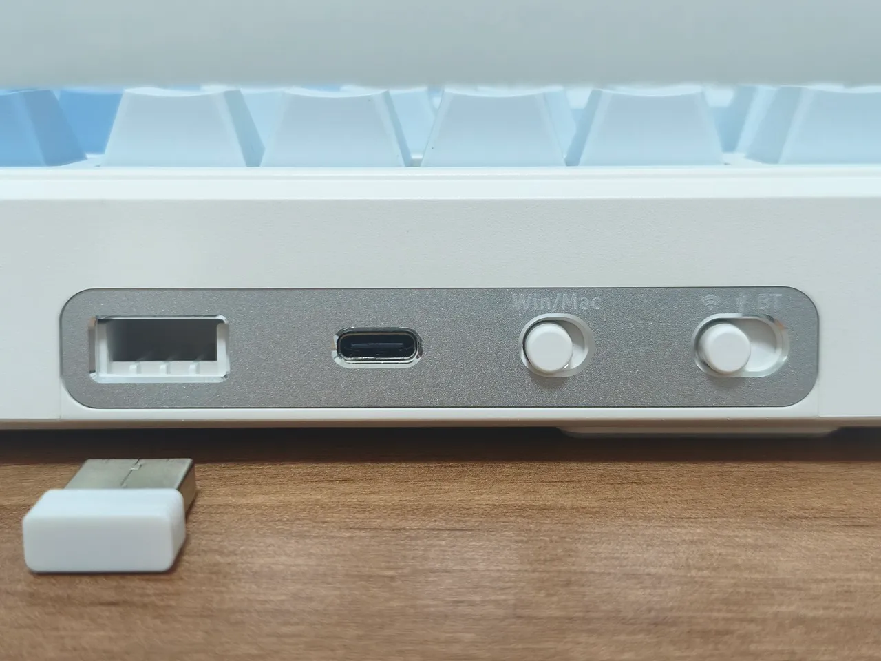 Located at the rear of the keyboard, you’ll find a USB compartment that contains a 2.4G USB dongle, as well as a Type-C port for charging and wired connectivity to a Windows PC. Furthermore, there is a switch to toggle between Win/Mac compatibility and a button to select different operation modes.