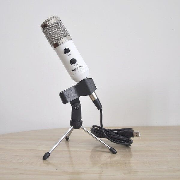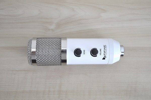 The FIFINE K056 Microphone is covered with a steel protective net and uses a type USB interface. It comes with two operation buttons. One for echo cancellation and another for adjusting the volume level. The FIFINE K056 Microphone package include few extra accessories, such as an adjustable stand and anti-wind foam cap. with this microphone, there is no need to add any external power source since it uses a single USB cable.