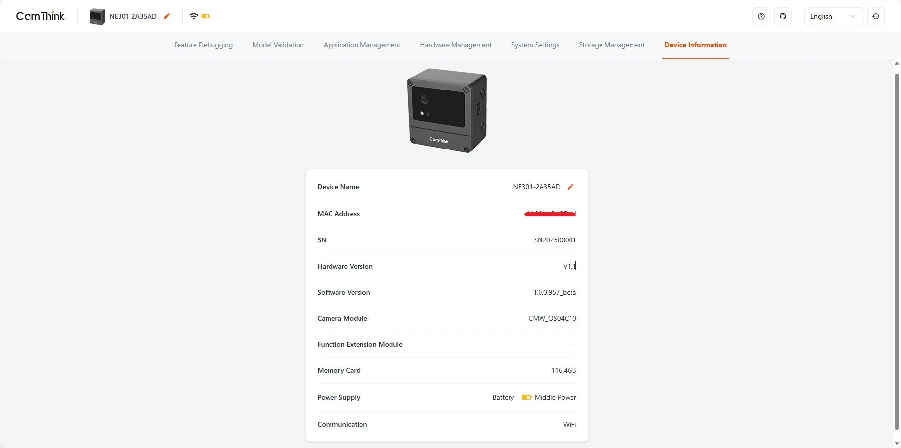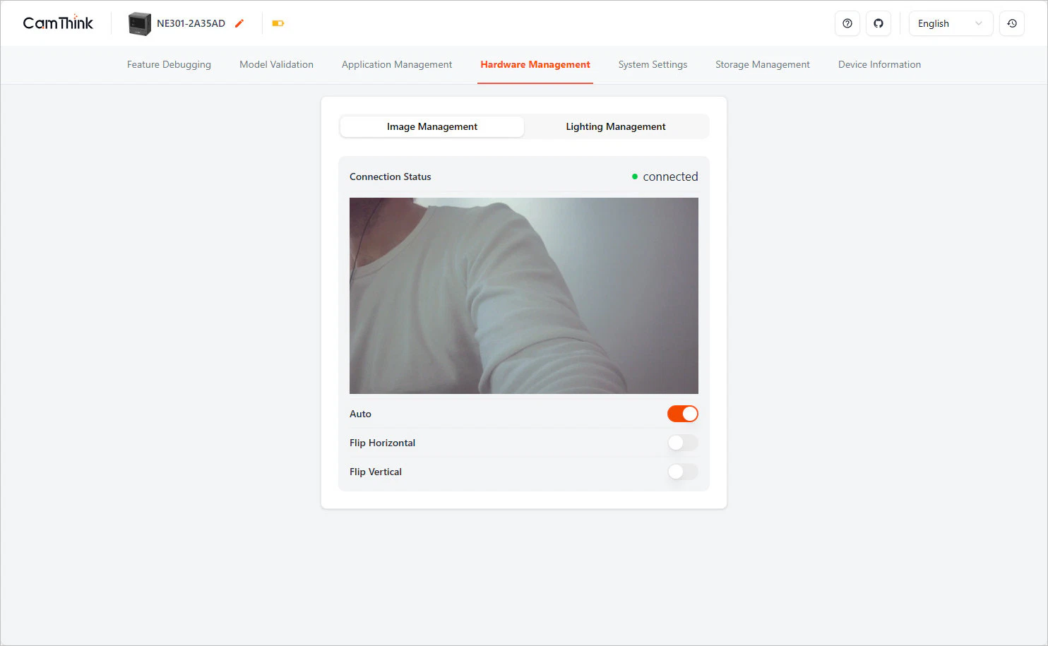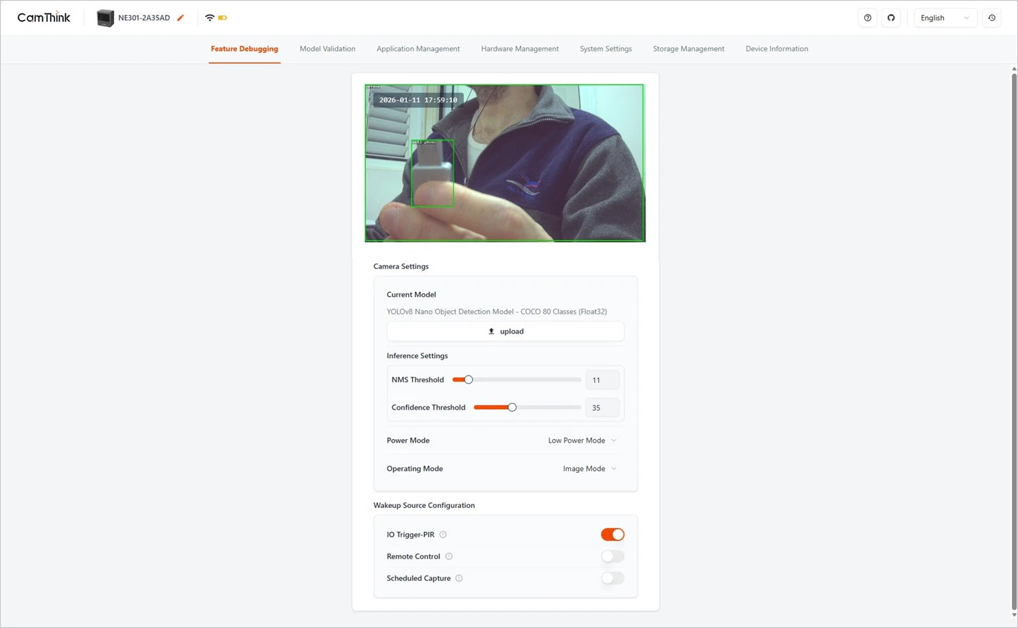 The NE301 comes with CamThink management software pre-installed on its 128MB HyperFlash. To access it, you will need to power the device and connect to it via Wi-Fi as an access point. Once connected, just open a web browser and enter the device’s gateway IP address: http://192.168.10.10. From there, the web interface lets you easily control camera functions and deploy AI models.