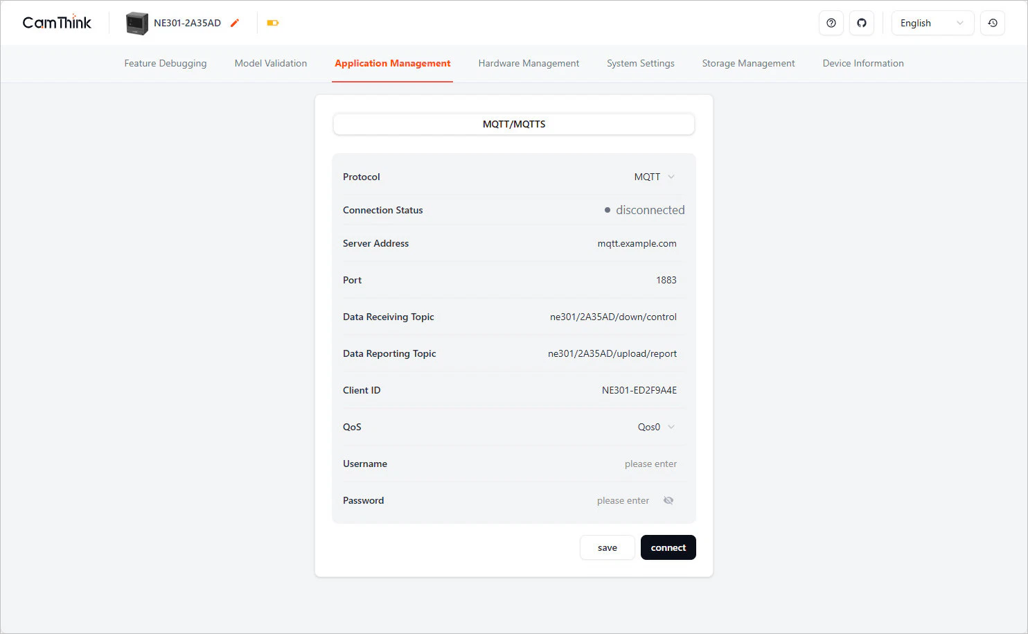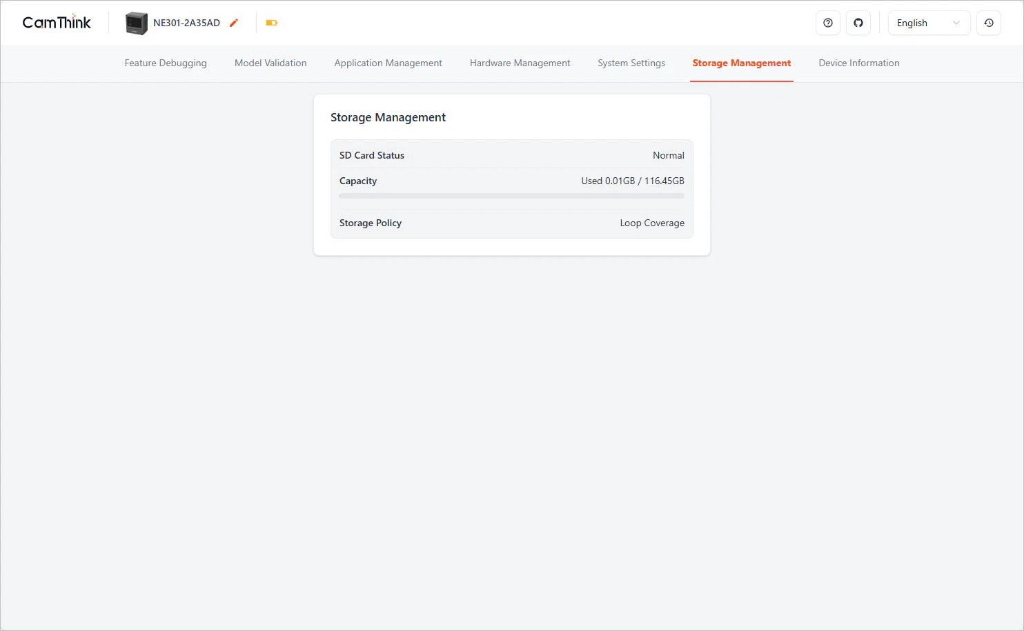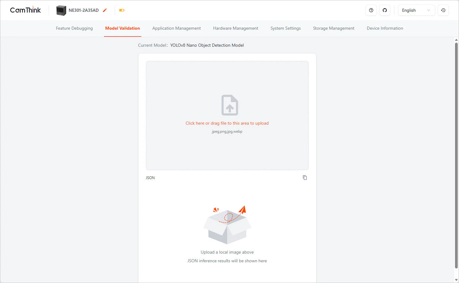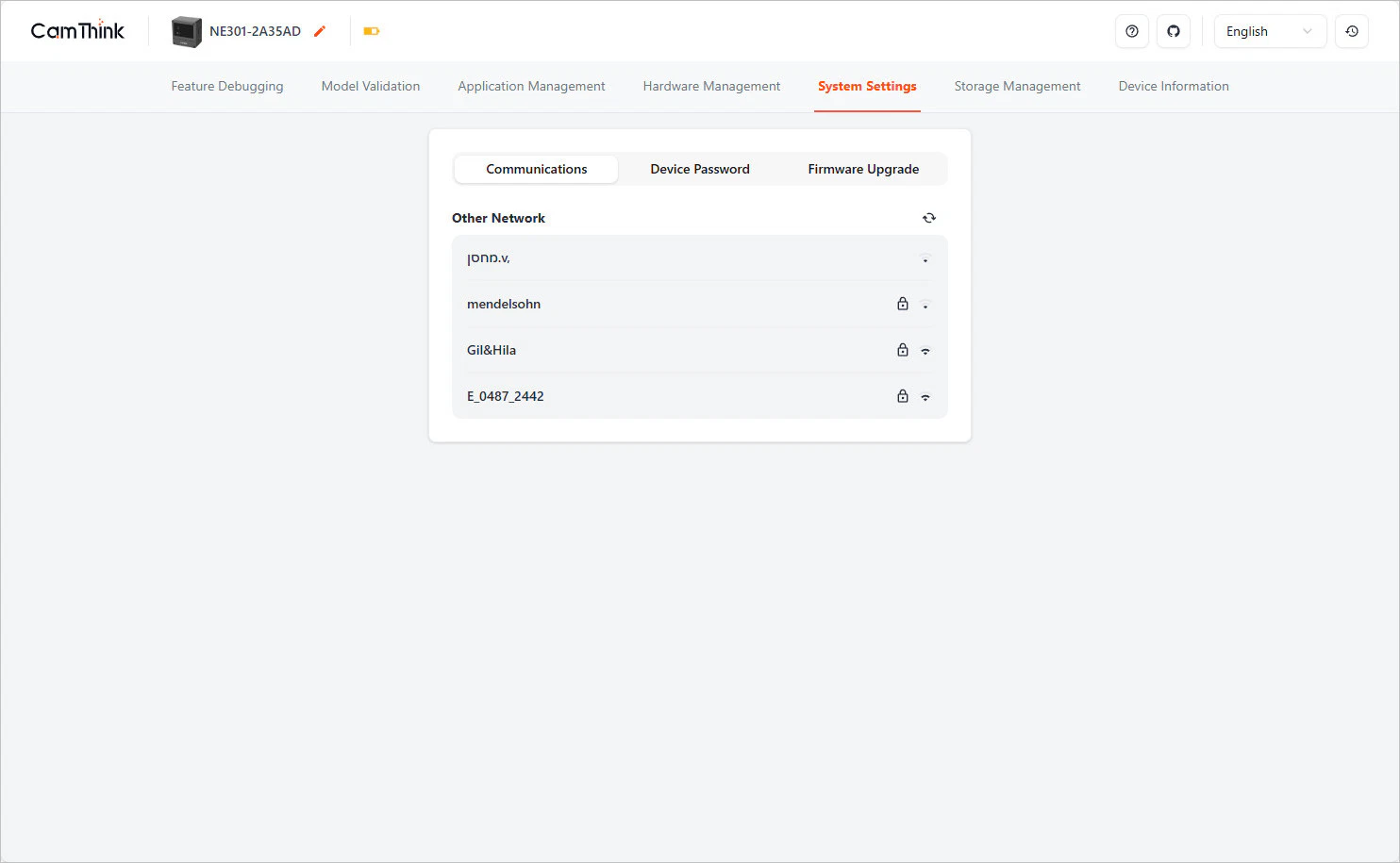 The NE301 comes with CamThink management software pre-installed on its 128MB HyperFlash. To access it, you will need to power the device and connect to it via Wi-Fi as an access point. Once connected, just open a web browser and enter the device’s gateway IP address: http://192.168.10.10. From there, the web interface lets you easily control camera functions and deploy AI models.
