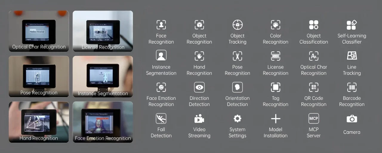 | Built-in Algorithms | ✔ Face Detection/Recognition ✔ Facial Feature Detection ✔ Object Recognition / Tracking ✔ Color Recognition ✔ Object Classification ✔ Self-learning Classification ✔ Instance Segmentation ✔ Hand Detection ✔ Hand Keypoint Detection ✔ Gesture Recognition ✔ Humen detection ✔ Humen keypoint detection ✔ Pose Recognition ✔ License Plate Recognition ✔ Text Recognition ✔ Line Tracking ✔ Expression Recognition ✔ Gaze Direction Detection ✔ Face Orientation Detection ✔ QR Code Recognition ✔ Barcode Recognition ✔ Tag Recognition ✔ Fall Detection |