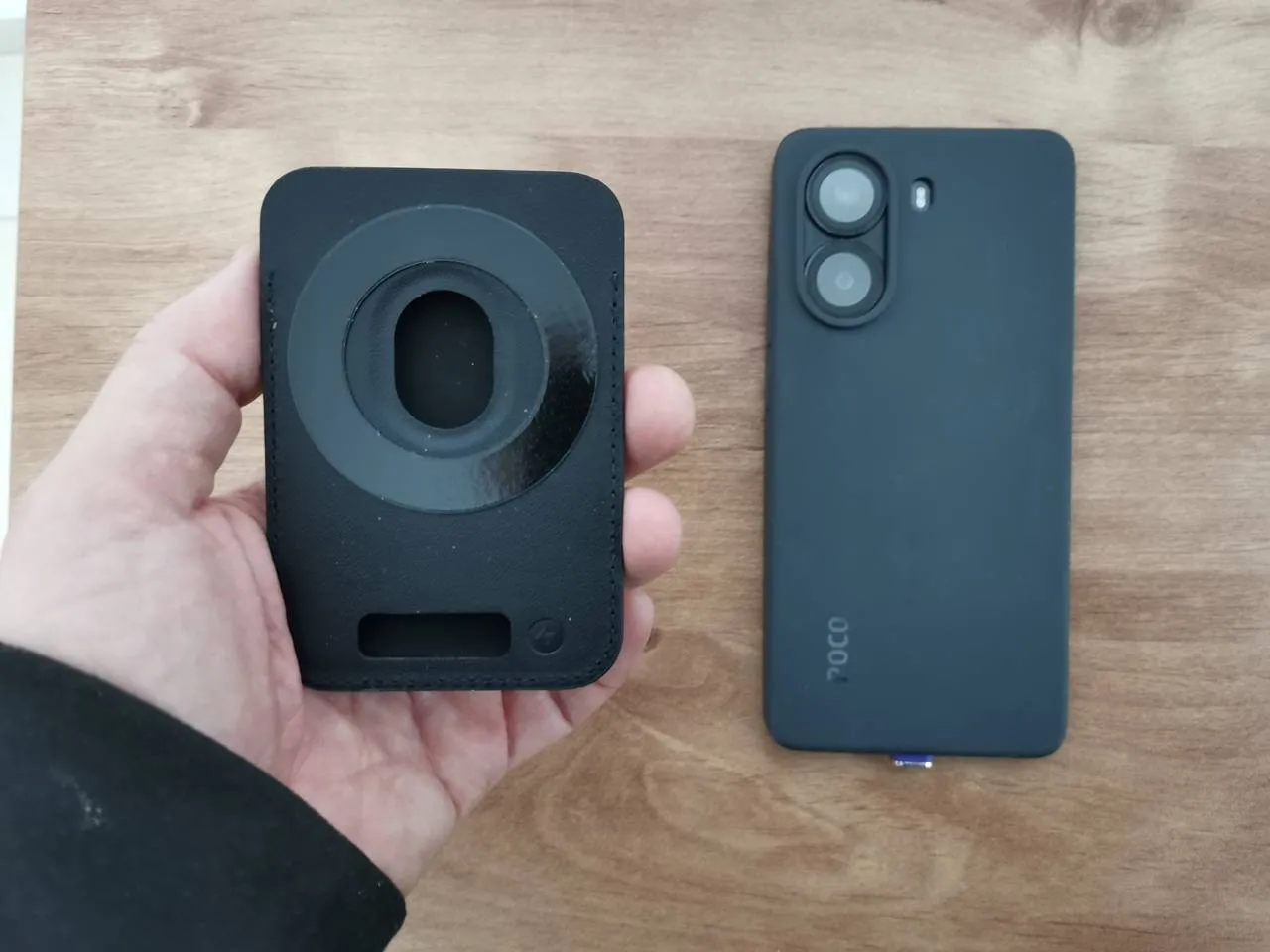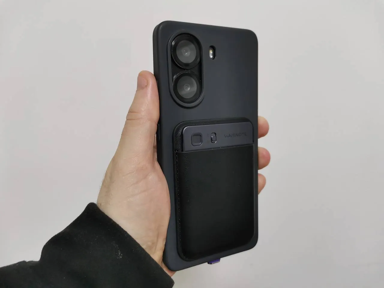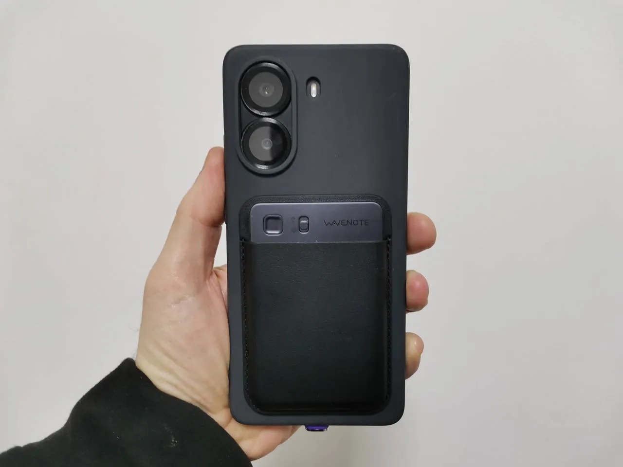 Attaching the WaveNote carrying case to the back of a POCO X7 Pro TPU case.