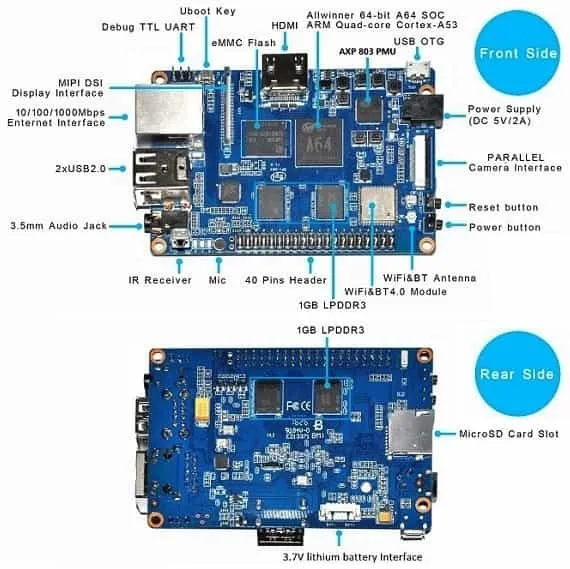 - SoC – Allwinner A64 Quad-core ARM Cortex A53 processor with