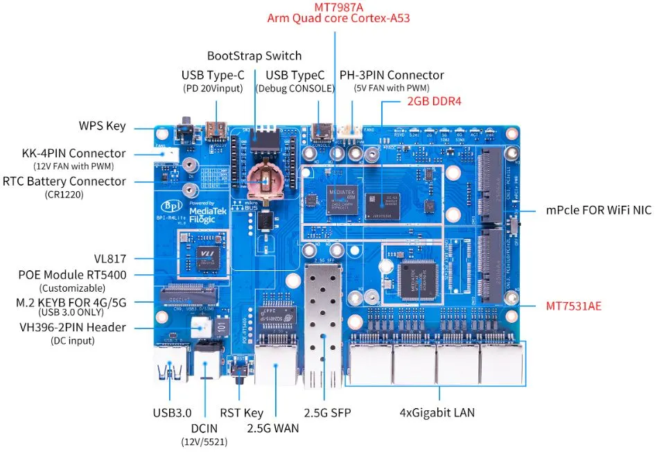 - The BPI-R4 Lite offers robust connectivity options with support for 4G and 5G modems through three a nano SIM slot and an M.2 Key-B interface.