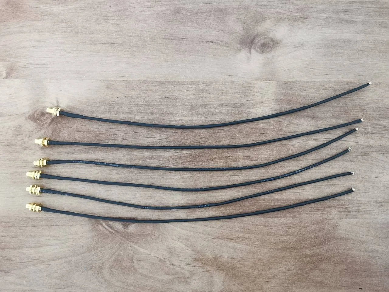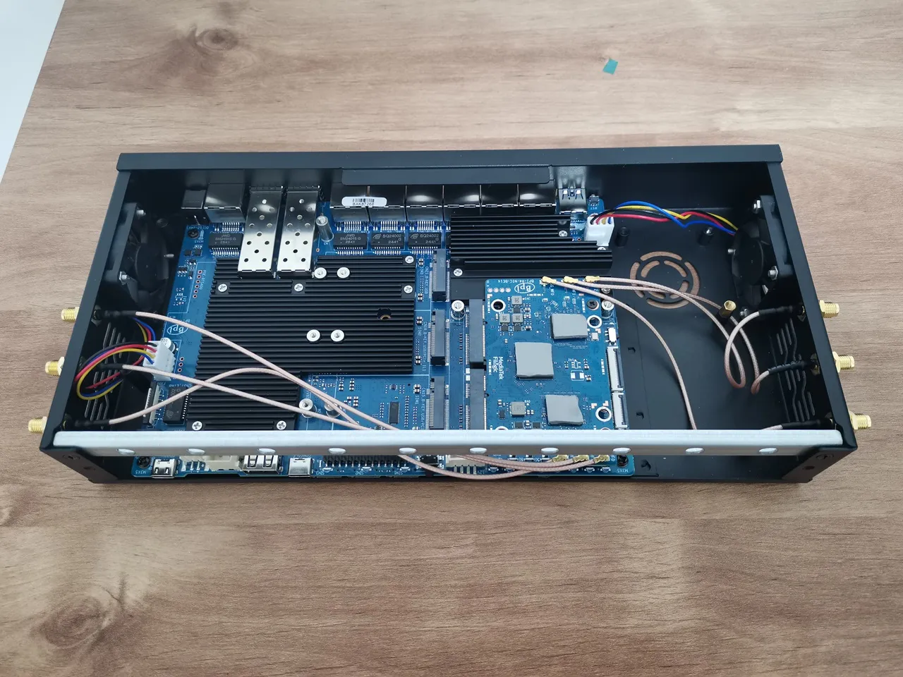 In our setup, we used three antenna holes on each side of the case, for a total of six. The case has 26 antenna holes altogether, with ten in the front and ten in the back, so wiring length isn’t really a concern. If you plan to use the side holes like we did for the BE14 NIC Module card, we initially tried shorter wires as shown in the photo, but we recommend using six 25 cm wires with RP-SMA female connectors.