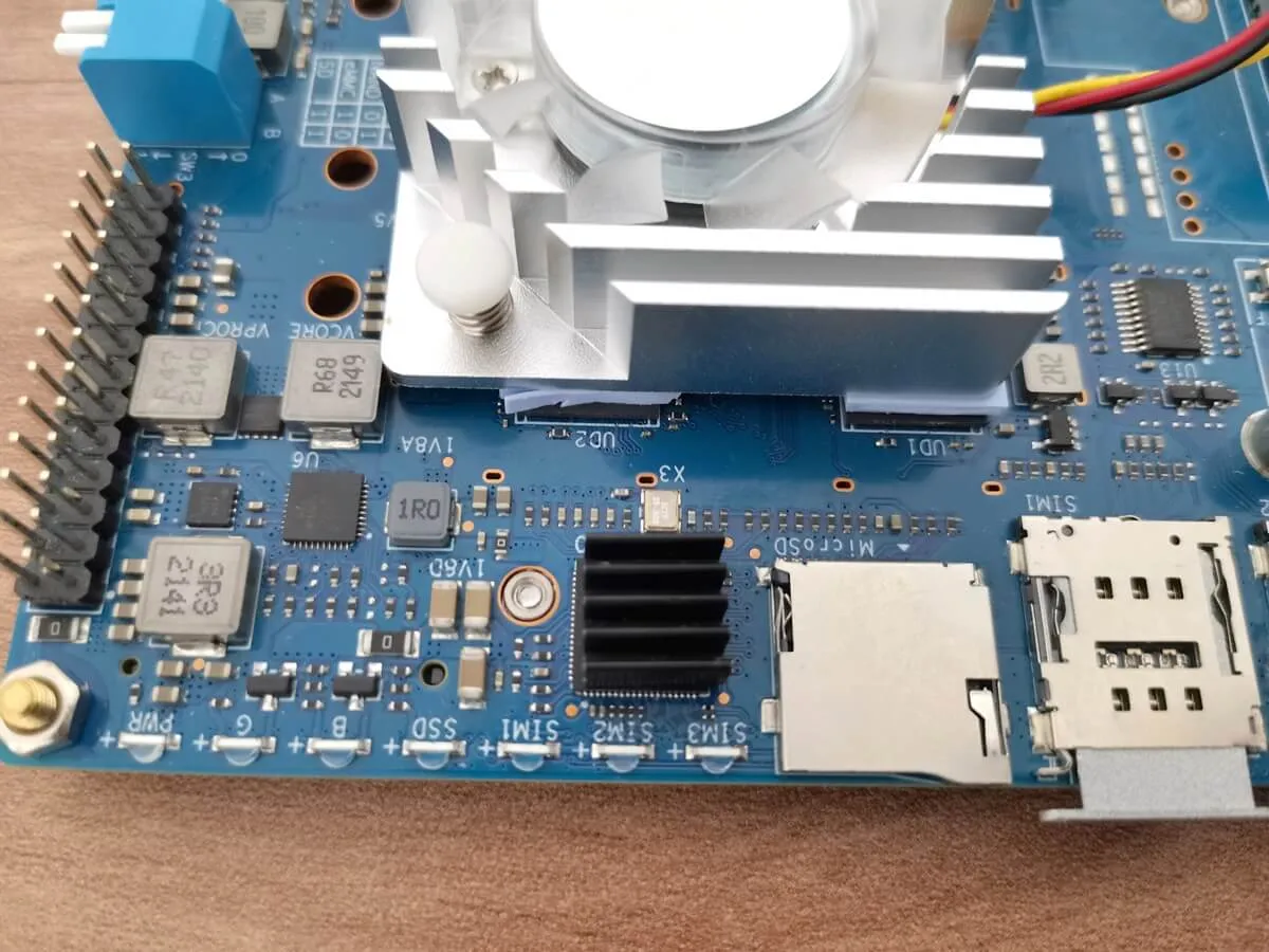 To create a heat sink for your R4 board, you have the freedom to design and customize it yourself. Just make sure that it meets the minimum dimensions of 40 x 46 mm to effectively cover and cool most of the chips. The height of the required heat sink will depend on the measurements of your case. However, for the VLI VL822-Q7 Hub Controller chip next to the Micro SD Card slot, you will need to use a separate 9×9 mm heat sink.