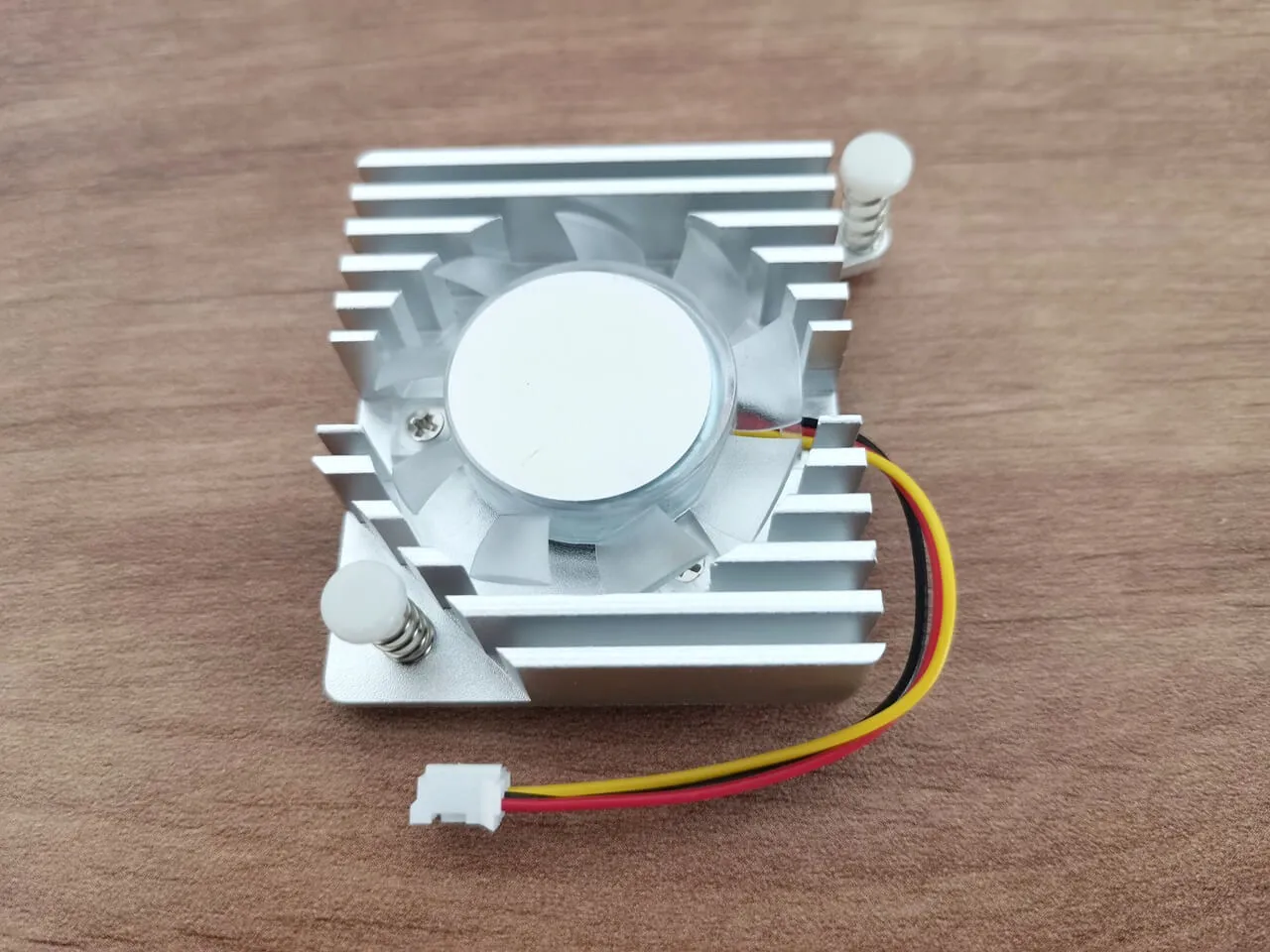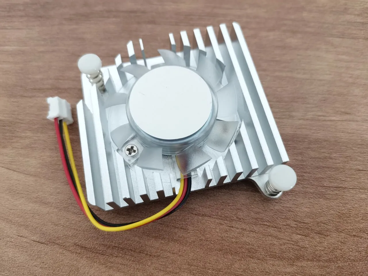 The active heat sink package includes four thermal pads that are placed on top of the R4 board’s main chips. For mounting it to the R4 there are also two plastic studs which are inserted to the board holes.