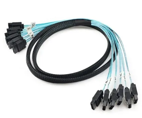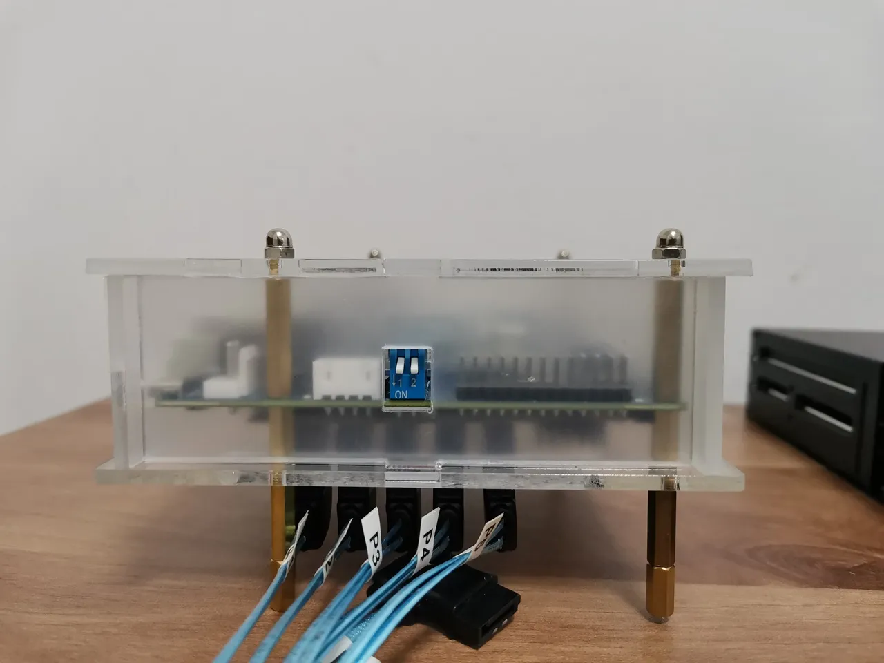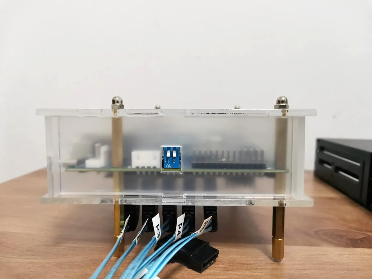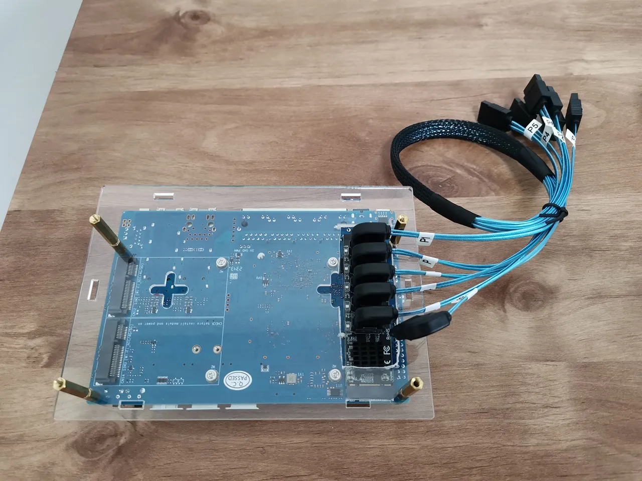 - Connecting 5-port M.2 NVMe to SATA 3.0 converter to SATA NAS rack ports via cable.