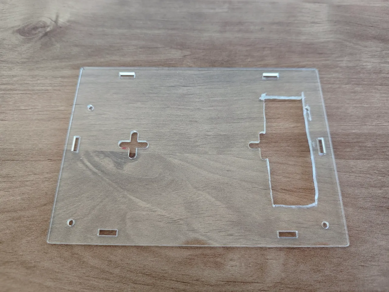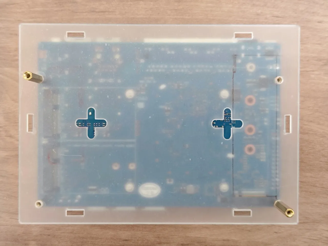 First, we must make some modifications to the acrylic plastic case to ensure a proper fit for the M.2 NVMe SATA. This entails cutting a rectangular opening in the case base, allowing easy access to the SATA connectors from the bottom. As for the SATA cable, we have selected connectors with a convenient 90-degree left bend. At the opposite end, we have chosen straight SATA connectors that will seamlessly connect to our NAS rack.