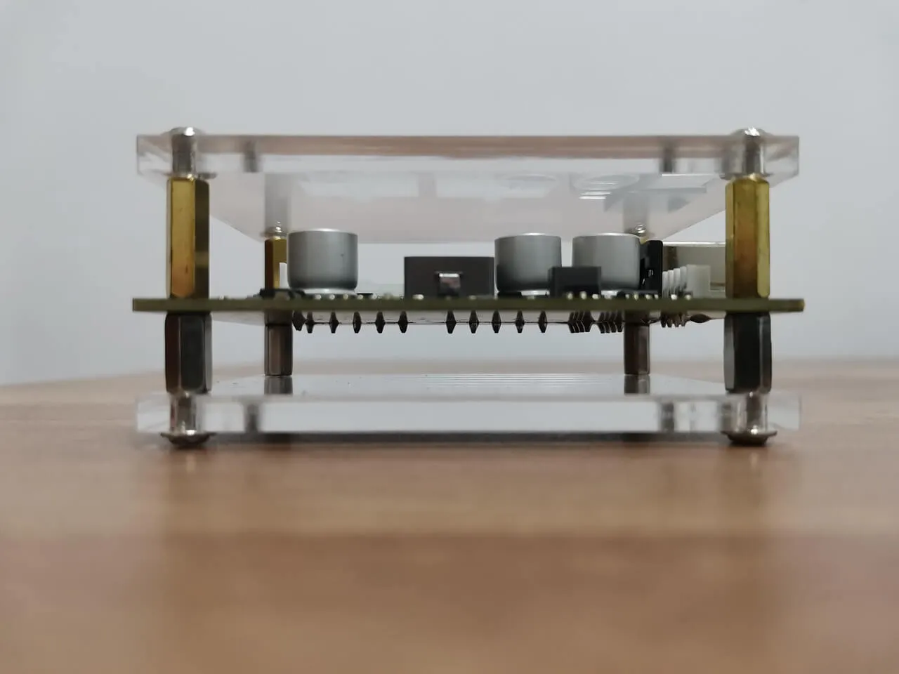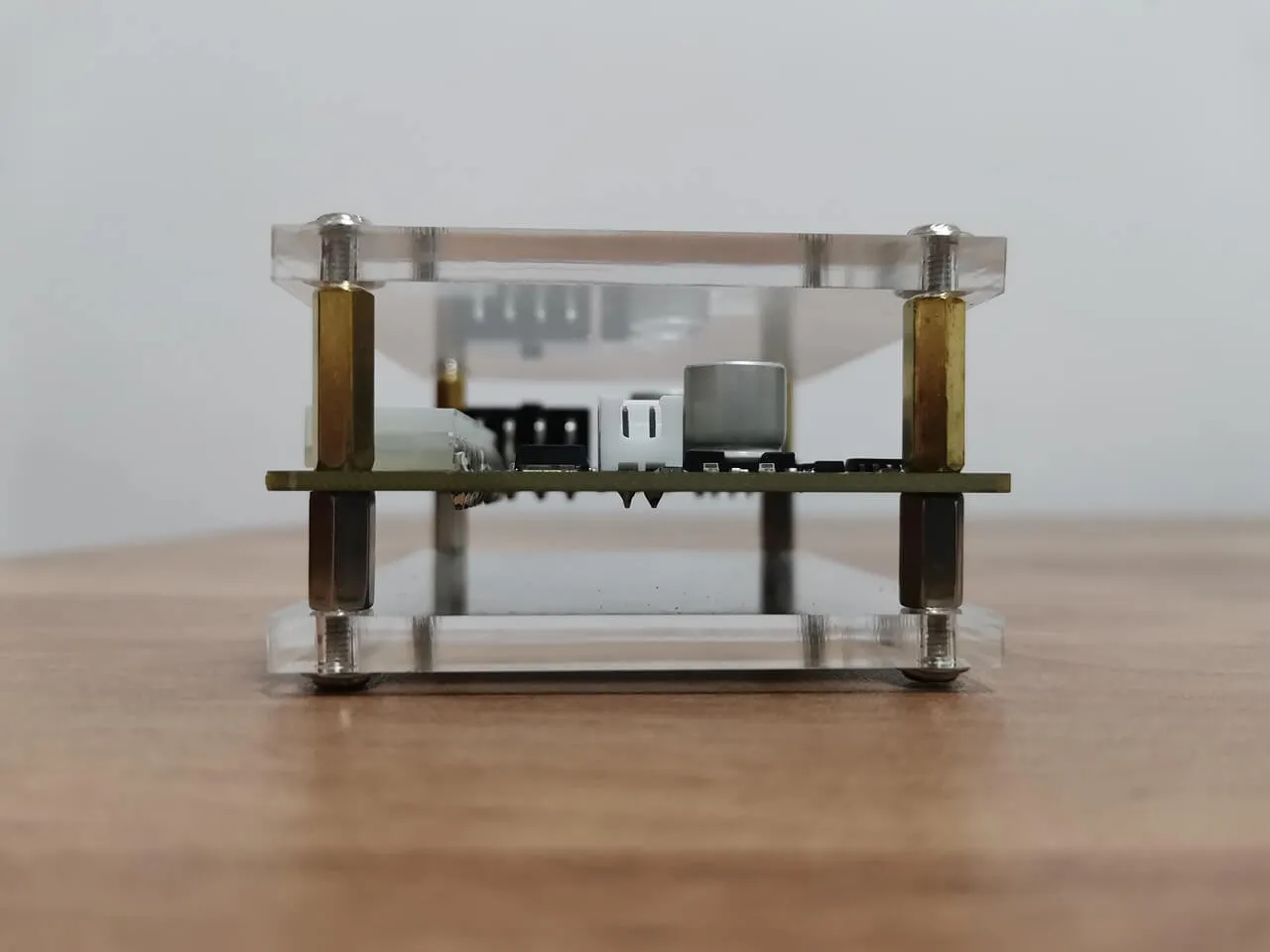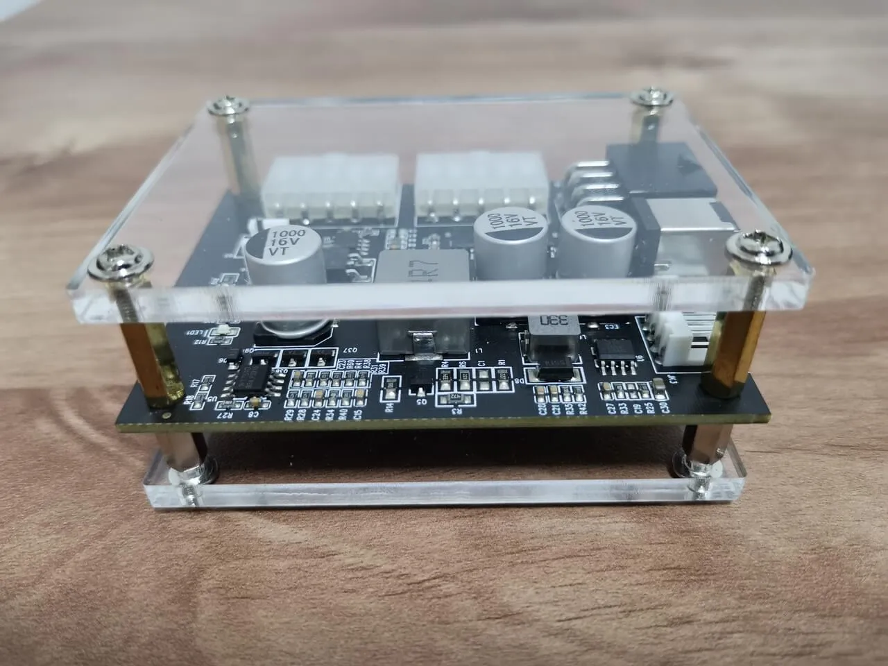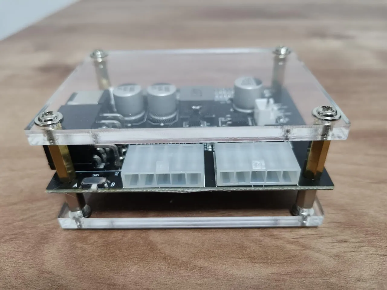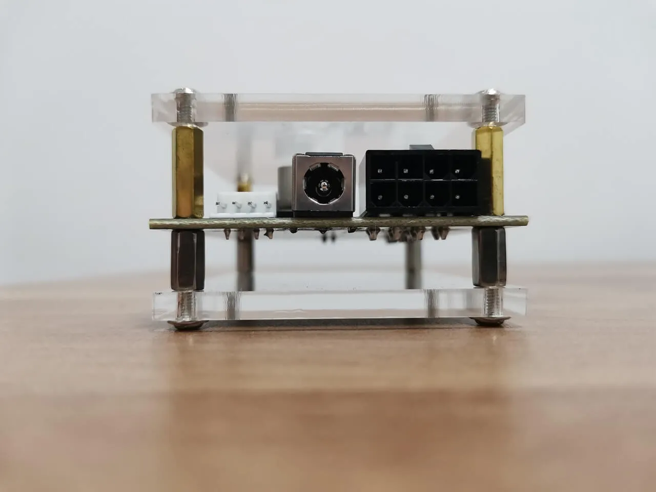 The power supply module is available in a bare board version or assembled inside a semi-open plastic case consisting of two ABS plates secured with four hex bolts and nuts. The board offers two modes of operation: Mode A, which is connected directly to the desktop PC power supply input signal, and Mode B, which can be switched to allow the board to independently provide the necessary power. For our small DIY project, we will need the use of Mode B. To switch to this mode, simply set it using the small switch embedded on the board.