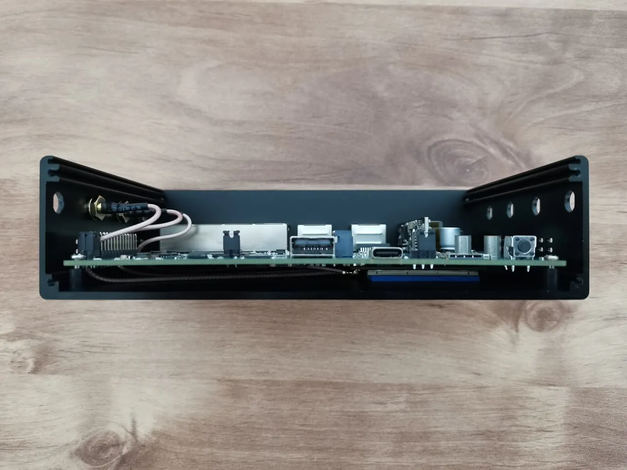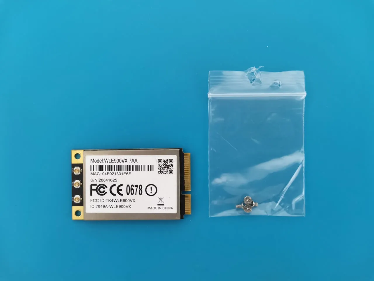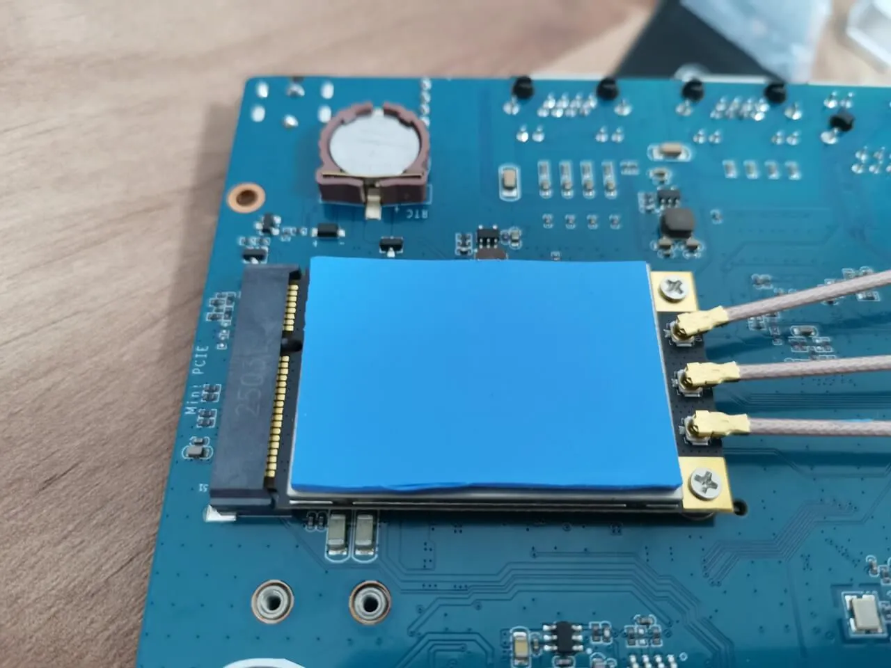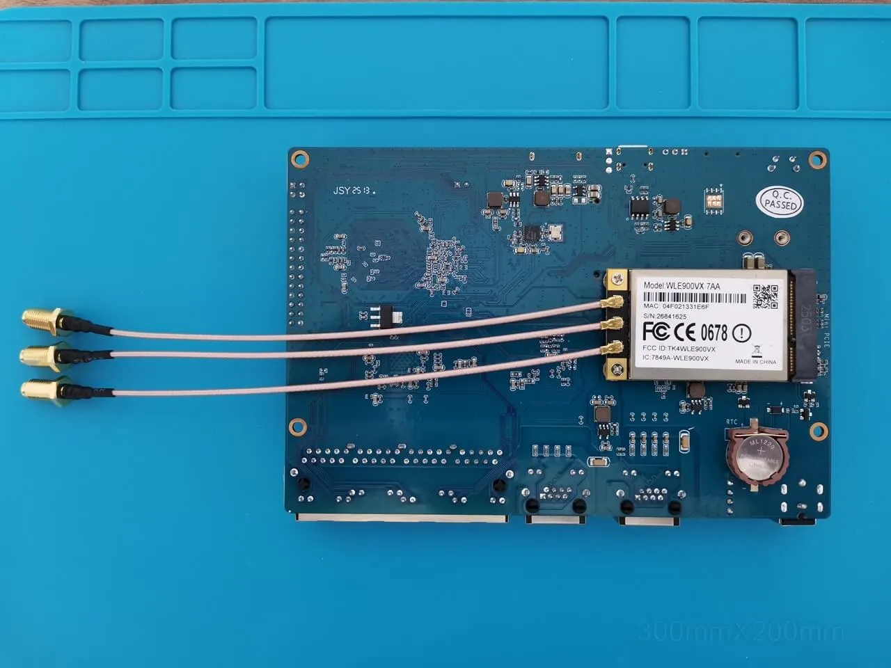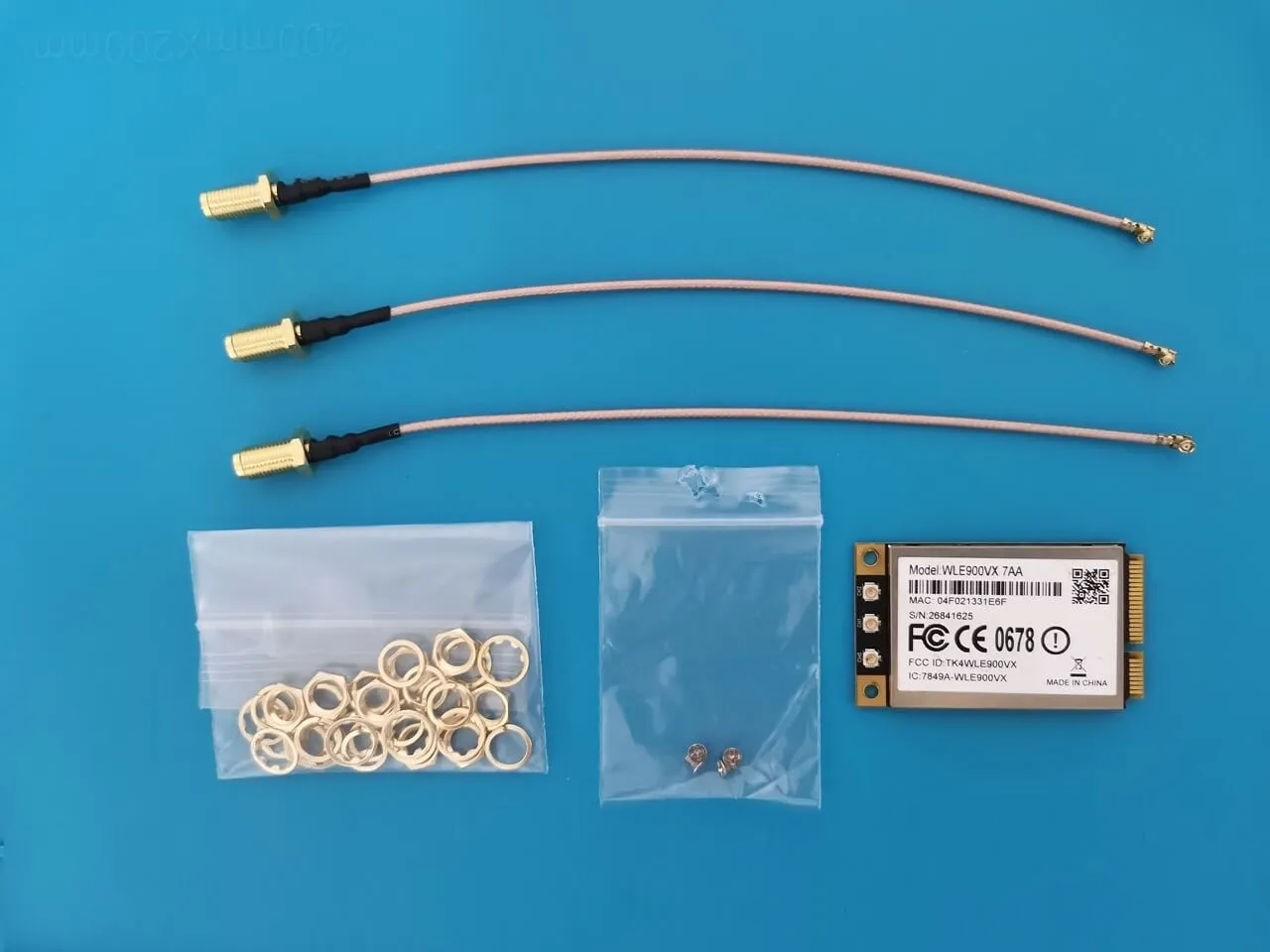 We successfully completed the installation of the WLE900VX module, which comes with three RP-SMA Male connectors. We used three cables, each measuring 15cm in length, which is sufficient for our needs and eliminates the necessity for longer cables. Additionally, we strategically placed a 1mm-thick thermal pad on the card to guarantee optimal contact with the case body, facilitating superior heat dissipation.