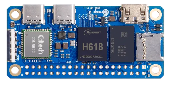 The new model that succeeds the M2 Zero. It has a huge improvement in performance. The SOC is upgraded to H618 and the CPU frequency is increased by 25%. The memory is upgraded to DDR4, the capacity is quadrupled, and 8G eMMC is added. It supports 5G Wi-Fi, and the USB interface has also been upgraded to type-C. It has the same form factor and 40-pin connector as the Raspberry Pi Zero W, and it will fit most Zero W cases and accessories. | |