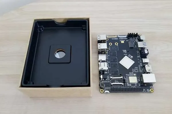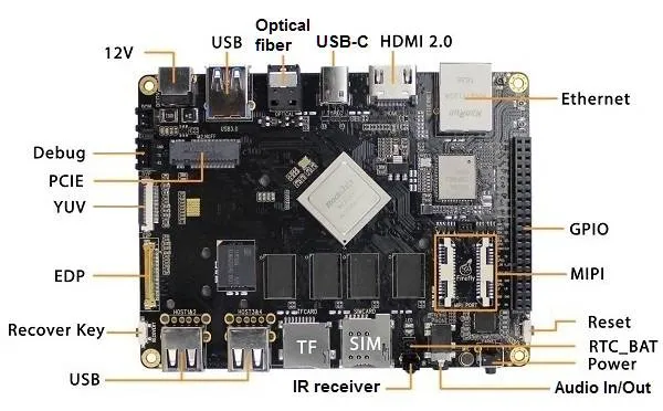 It has onboard eMMC with up to 128GB storage, Onboard Gigabit Ethernet, Dual Band 802.11AC WiFi, Micro-SD card slot, M.2 slot for additional storage via SATA Expansion card, HDMI 2.0, Display Port 1.2, 3.5 mm audio, S/PDIF port, a Headphone jack, 802.11ac WiFi, Bluetooth 4.0, Dual MIPI-CIS interface, USB 2.0 and USB 3.0 Type-C port.