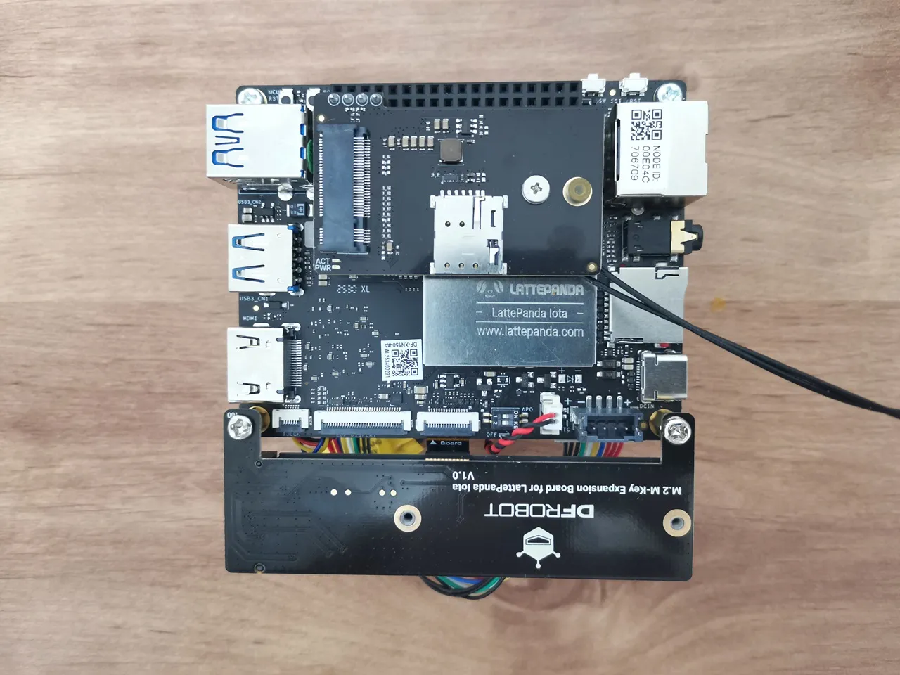 There’s also the option to assemble the NVMe expansion card outward instead of inward. This gives extra room to access the eDP and touch connectors and makes it much easier to insert a micro-SIM card into the 4G/LTE expansion card. Additionally, you can assemble the PSU expansion board either beneath the IOTA board, as we did, or place it above, on top of the rack above the IOTA board.