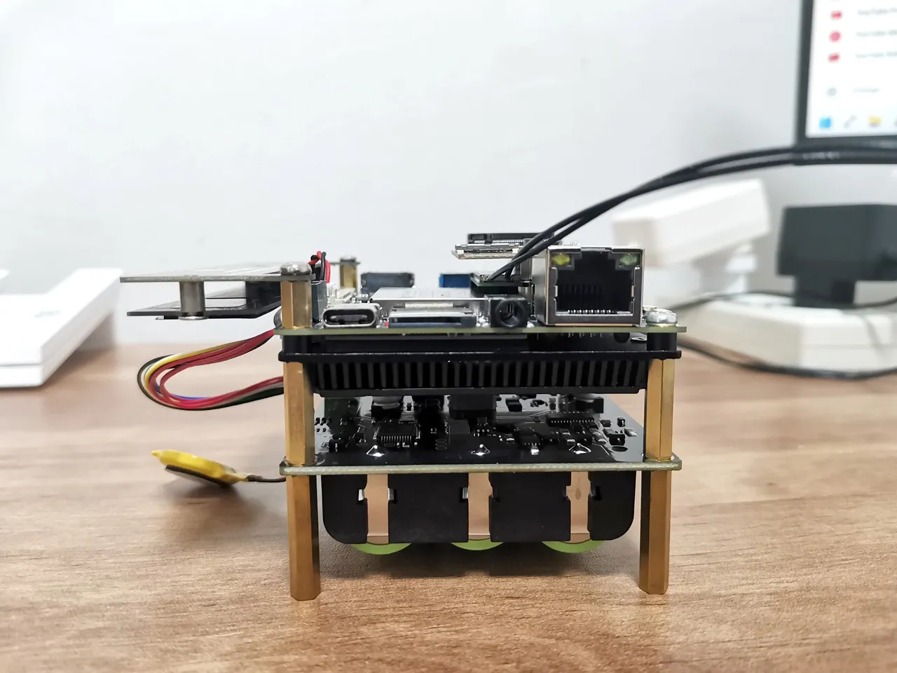 There’s also the option to assemble the NVMe expansion card outward instead of inward. This gives extra room to access the eDP and touch connectors and makes it much easier to insert a micro-SIM card into the 4G/LTE expansion card. Additionally, you can assemble the PSU expansion board either beneath the IOTA board, as we did, or place it above, on top of the rack above the IOTA board.