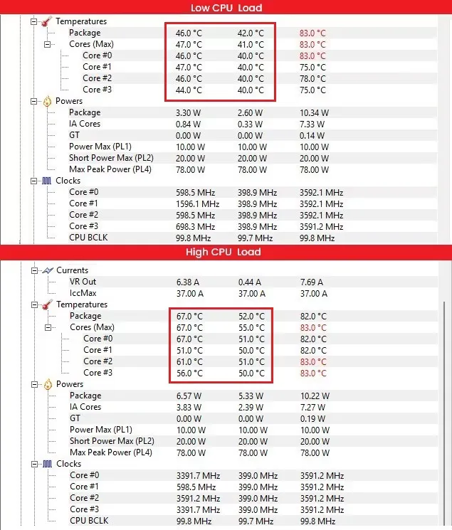 | power limit 2 | 20000 | 2000 is extremely high and likely unrealistic. Typical PL2 values range from 100W to 300W depending on the CPU. A value of 20000 mW could cause immediate thermal issues or be ignored by the system. |