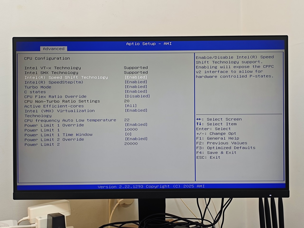 | power limit 1 time window | 0 | This defines how long the CPU is allowed to operate at PL1 before adjusting. Value of 0: Often interpreted as “infinite” or “disabled,” meaning the CPU can stay at PL1 indefinitely. Combined with a high PL1 value, this could lead to thermal throttling or damage if cooling isn’t sufficient. |