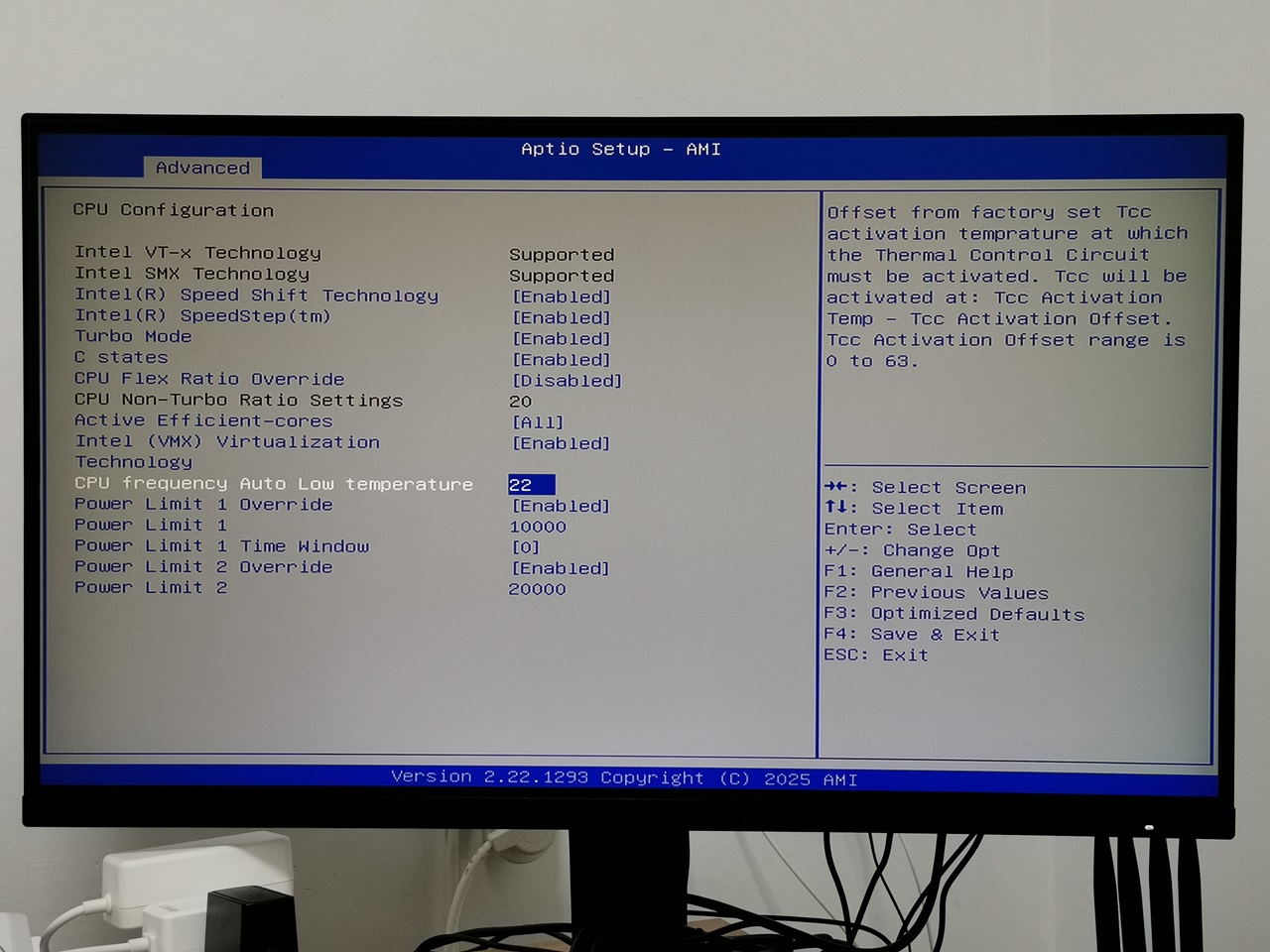 | CPU frequency auto low temperature | 22 | The CPU frequency adjusts automatically depending on temperature. When temperatures are low (like 22°C), the BIOS might permit higher frequencies or keep them lower to save power. |