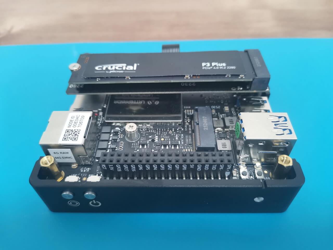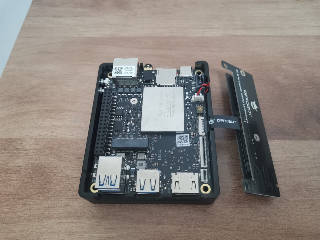 As shown in the photo below, the board fits perfectly, but if you need the NVMe option, the upper-case cover won’t close properly due to USB interference and the case’s low height. You can use the case as a semi-open option, but DFRobot should consider offering an active fan cooling option; otherwise, the board will overheat.