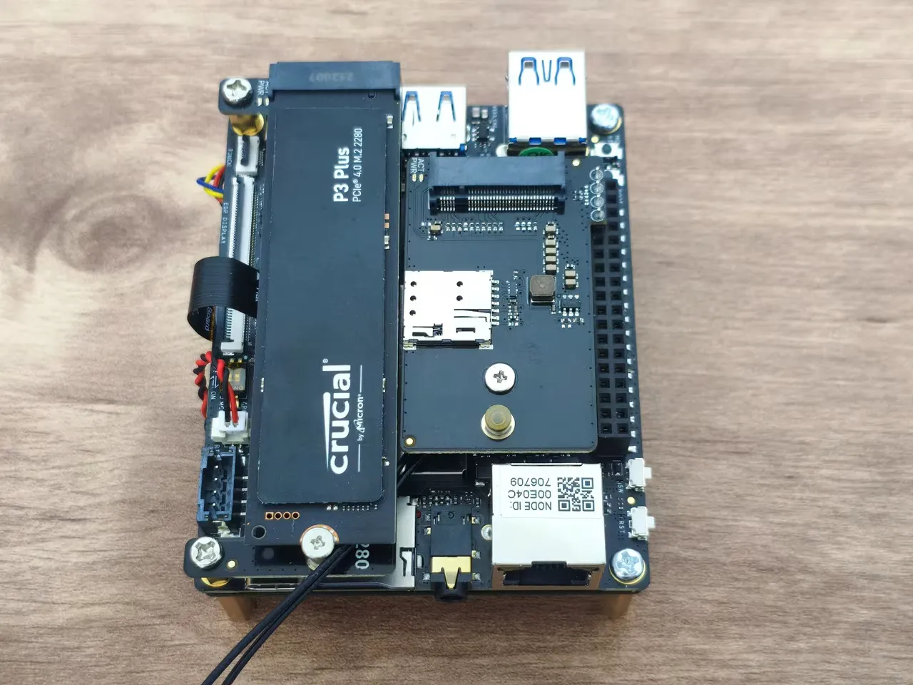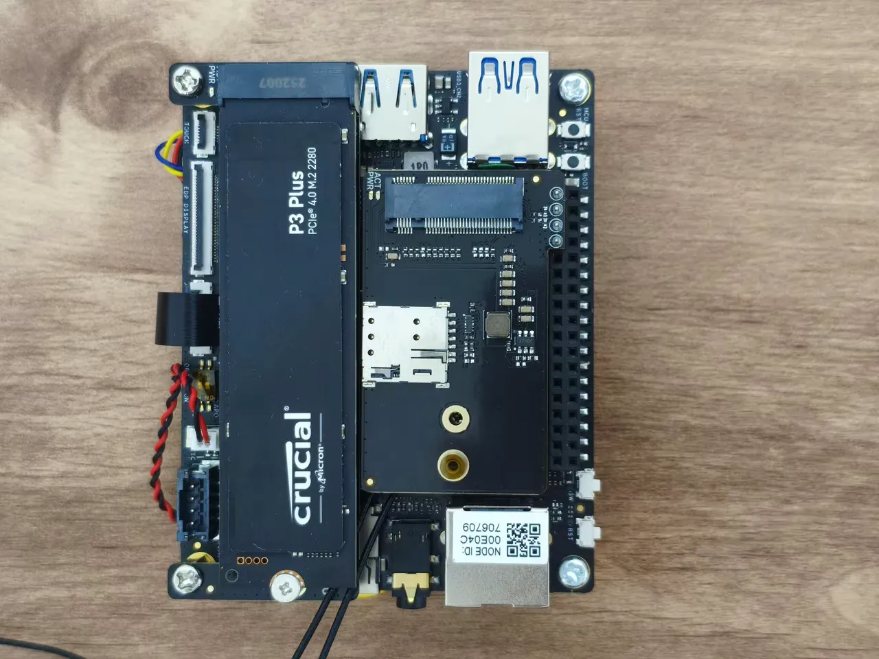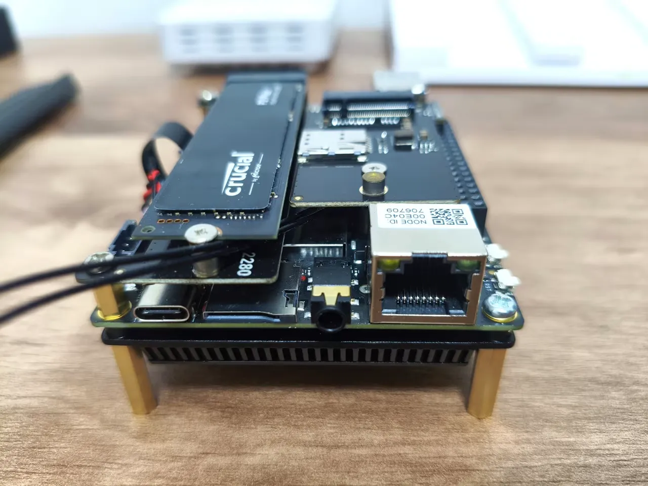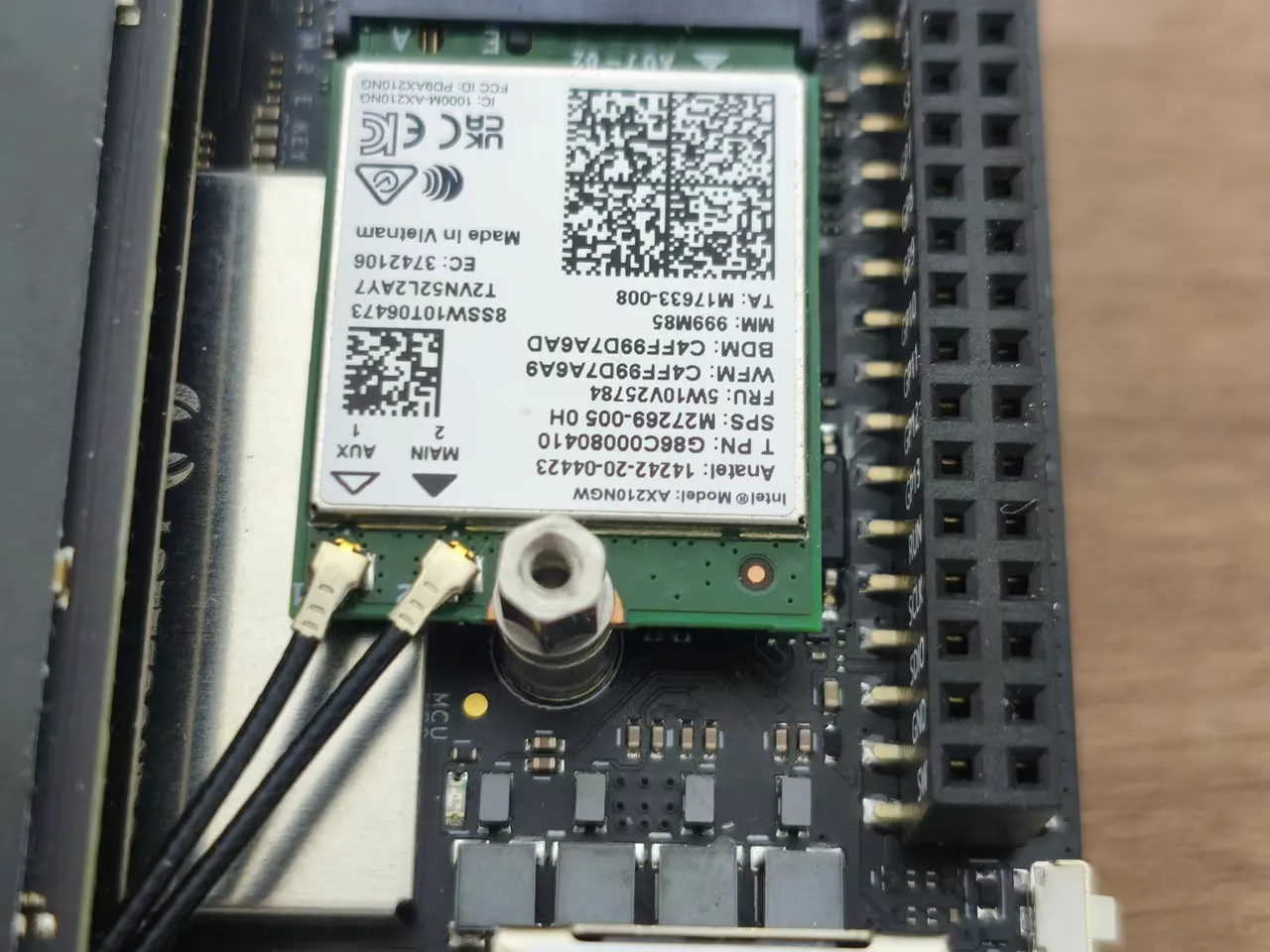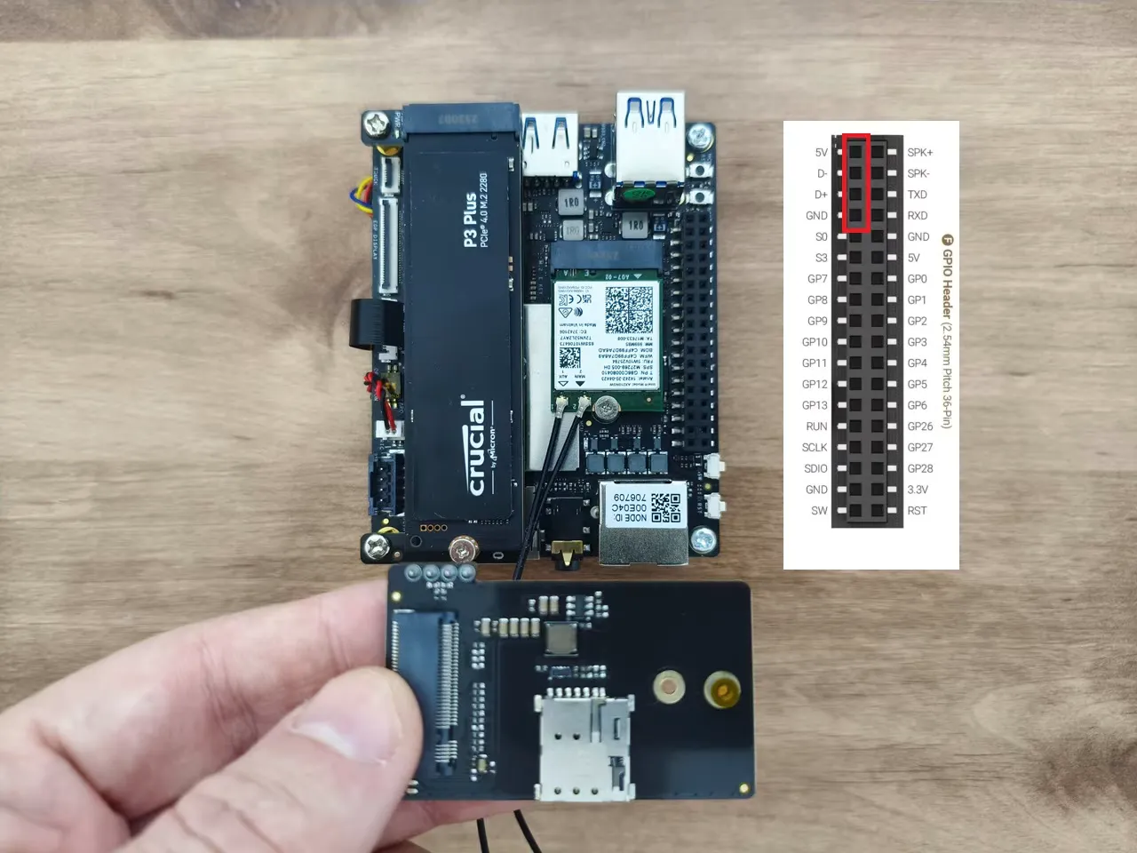 The expansion card connects to the GPIO pins interface using a 4-pin header but needs extra support during assembly. To achieve this, you should extend the screw height with a hex standoff from the screw pack included with the card. As shown in the photos below, the expansion card is essentially assembled above the WiFi card, right next to our 1TB NVMe SSD we previously installed.
