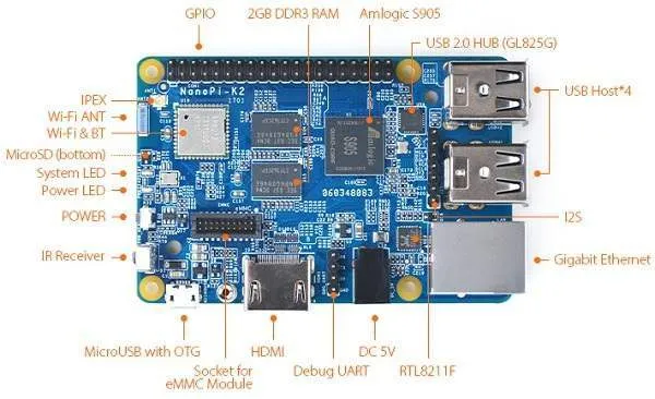 The NanoPi K2 single-board computer is FriendlyELEC (formally FirendlyARM) recently launched board, powered with the latest low-end Amlogic 905 SoC. This new board features a 60 pin header GPIO compatible with Raspberry Pi boards as well as onboard WiFi, Gigabyte Ethernet, IPEX Antenna interface, Micro SD Card slot, IR Receiver, four USB 2.0 Hosts, HDMI 2.0 capable of outputting video at 4K@60fps. In terms of driver support and compatibility, this SBC is equipped with a pantra Mali 450 GPU with decent software support from the open-source community, including Amlogic company.