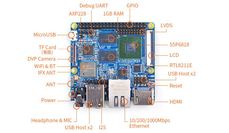 In addition, the NanoPi M3 has a Micro USB port for power supply and an onboard porcelain antenna. The Board integrates various ports and interfaces, such as DVP Camera/LVDS/HDMI/LCD interfaces, Ethernet, I2S, a 3.5 mm audio jack, and four USB v 2.0 ports.
