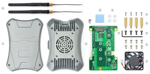 The new well-crafted metal case design makes sure the board is completely mounted inside a closed case. FriendlyElec has included some additional items. A small cooling fan is assembled at the bottom of the case protected by a grill, with a thermal pad for the CPU, a pair of external Wi-Fi antennas, and an NVMe SSD Adaptor board.