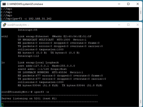 We Conduct a throughput speed test between a PC running Windows 11 and the NanoPi R5S board. For the testing tool, we used iPerf to check the maximum achievable bandwidth. Our maximum peak bandwidth was 946Mbps (Transmit & Receive),which correlates with FriendlyElec’s product advertisement showing an attainable bandwidth of 941Mbps.