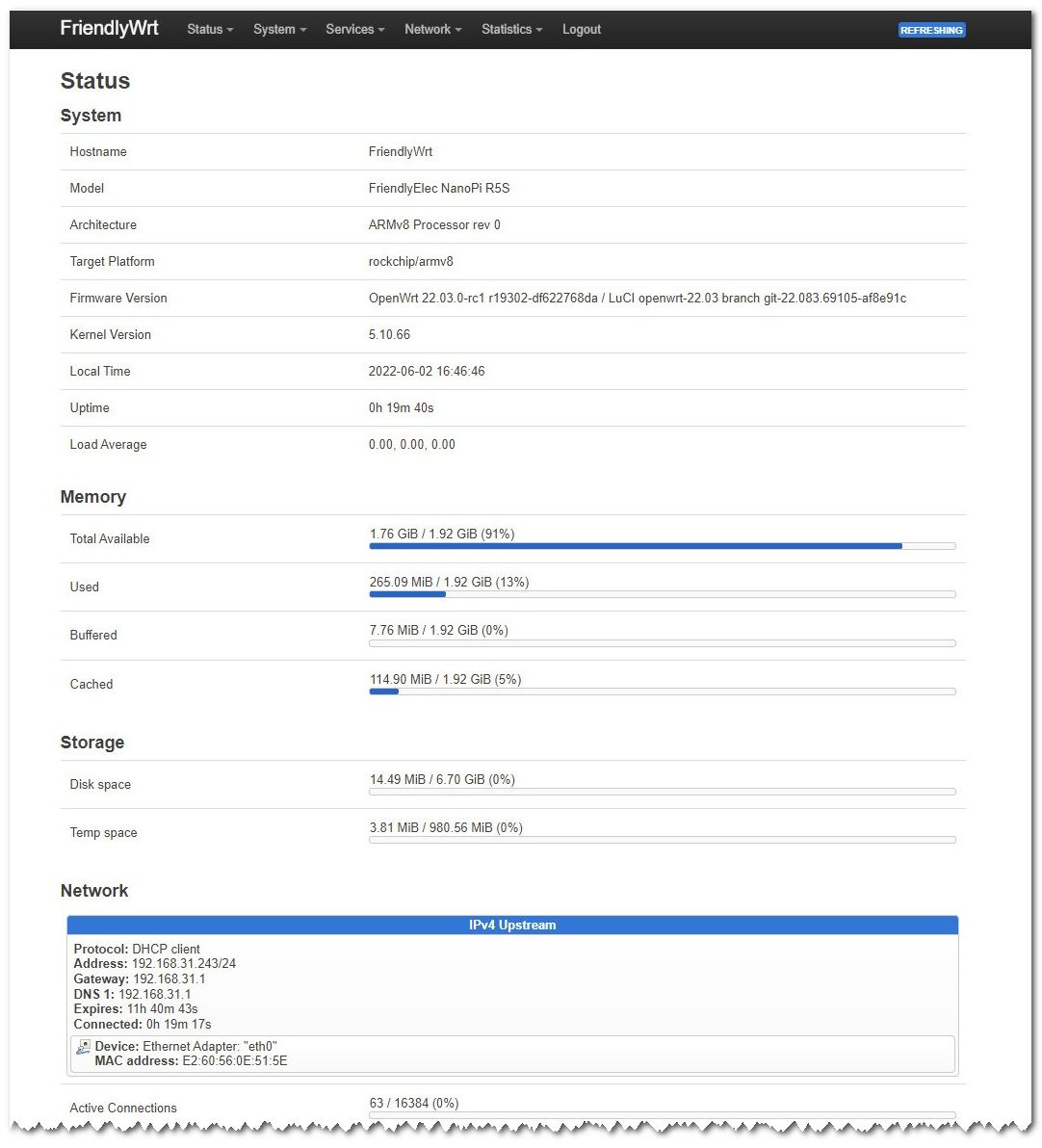 You were playing with FriendlyWrt, a customized version of OpenWrt developed by the FriendlyElec team. According to system information, only 9% of 2GB RAM is utilized, maintaining low system resources in idle operation mode. Also, using the maximum bandwidth provided by your ISP is achievable and highly recommended by connecting the board to 2.5G LAN or WAN ports in your router.