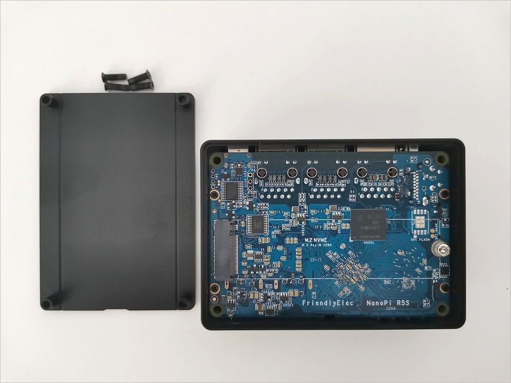 FriendlyELEC has equipped the NanoPi R5S with 2 GB LPDR4x RAM, 8 GB eMMC flash memory, a microSD card slot, and an M.2 2280 for NVMe SSD. FriendlyELEC company included: