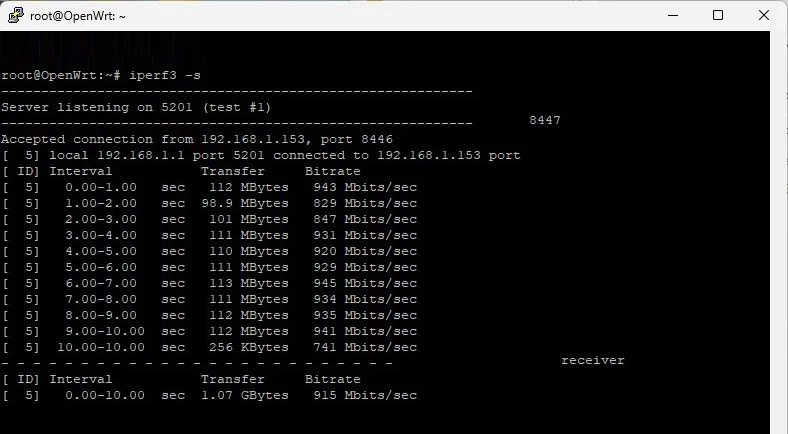 In this test, we configured our OpenWrt One to function in server mode, while our Windows 11 desktop PC served as the client. The results were consistently impressive, with throughput speeds reaching approximately 916 Mbps.