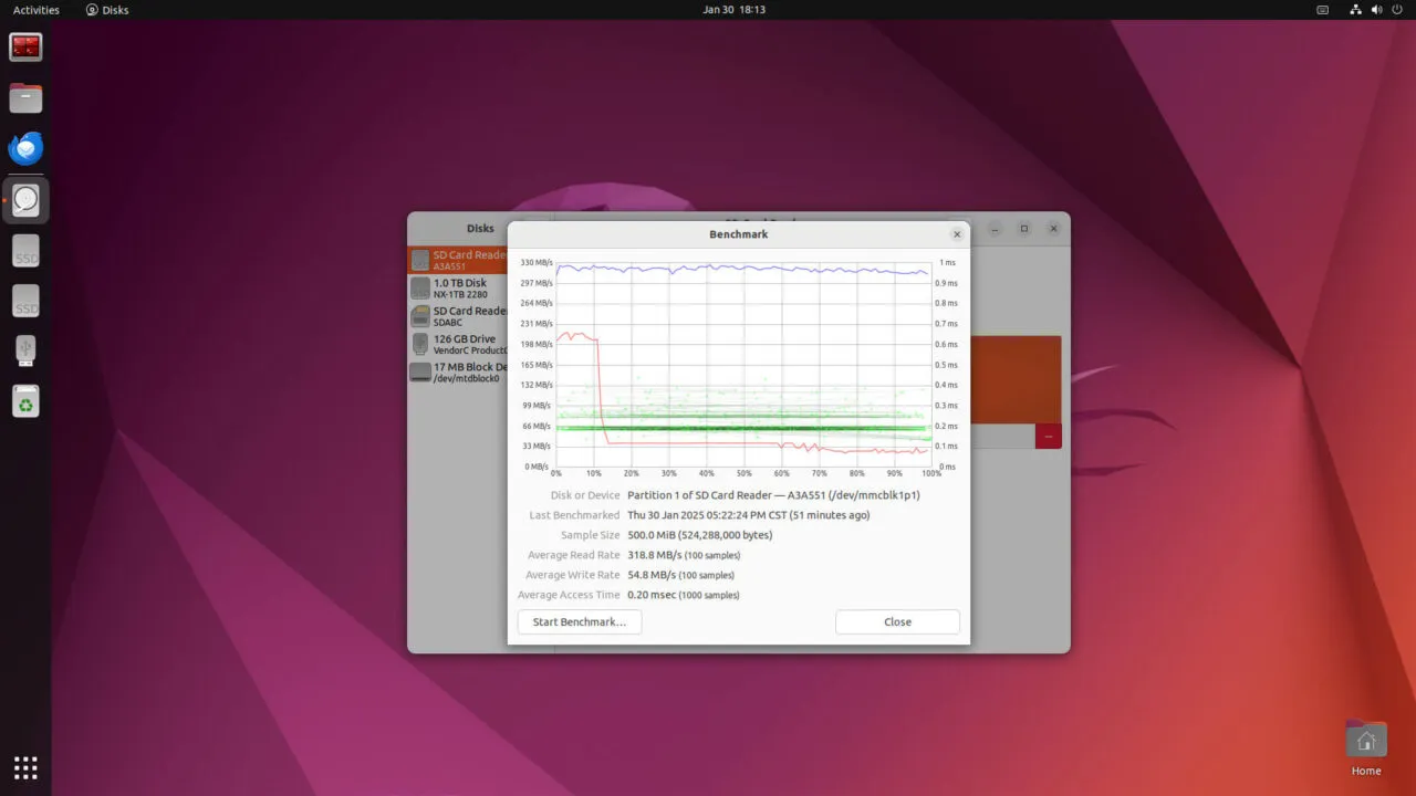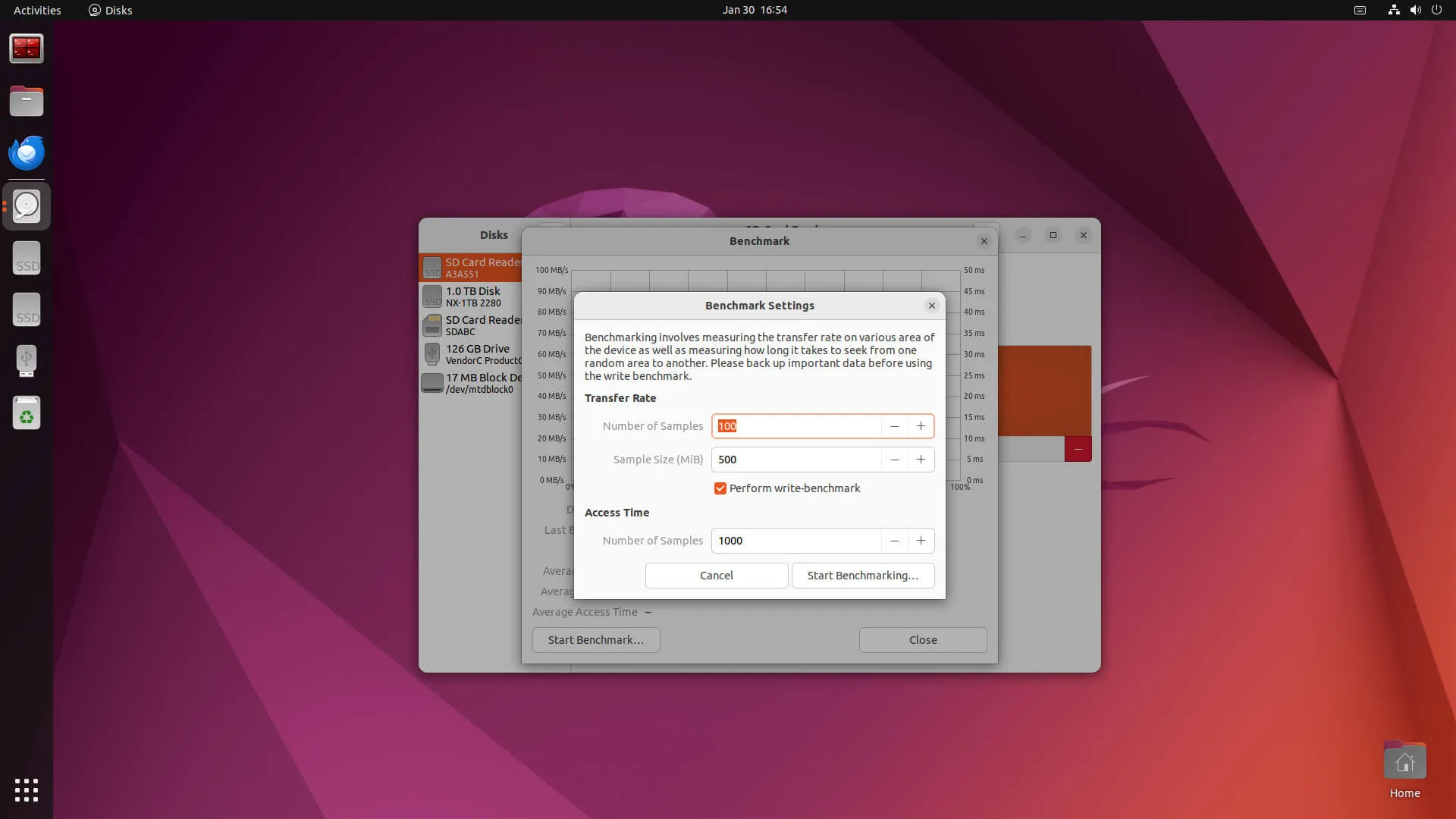 For our thorough testing of throughput data speeds, we utilized the Gnome Disk Utility, which operates seamlessly within the Ubuntu environment. This application provided us with the necessary tools to accurately assess the performance of our storage devices. By leveraging its capabilities, we were able to gather reliable data that reflects real-world usage scenarios.