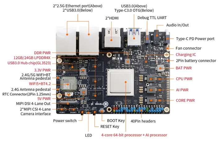 The Basic variant (INT8) includes up to 16GB LPDDR4X and a 32MB SPI flash, while also allowing for additional storage options like a microSD card, an eMMC flash module, and/or an M.2 NVMe or SATA SSD. It is equipped with two HDMI 2.0 ports, one MIPI DSI connector, a 3.5mm audio jack, two MIPI CSI camera interfaces, Gigabit Ethernet, and Wi-Fi 5 connectivity, a number of USB ports, and a 40-pin GPIO header for expansion.