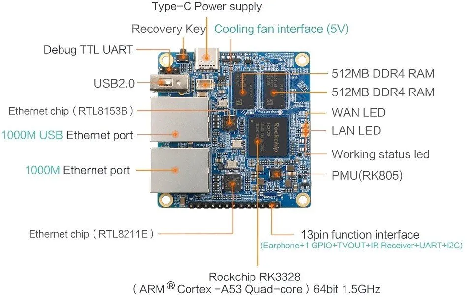 - CPU: Rockchip RK3328 Quad-core ARM Cortex-A53 64-bit processor, main frequency speeds up to 1.5GHz