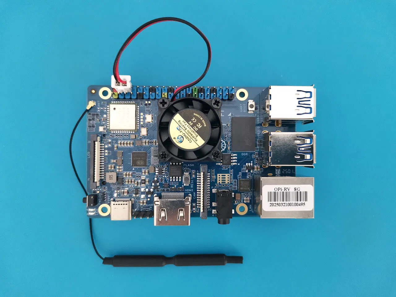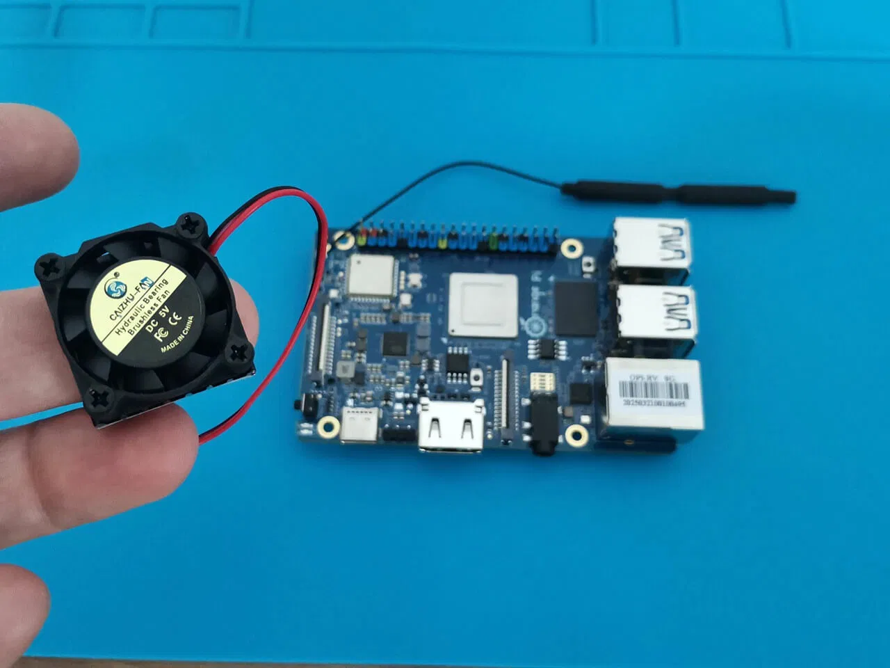 It could pose a challenge since neither Orange Pi company, nor its partner supplier has supplied one yet. In our quest for better cooling solutions, we’ve added supplementary heatsinks on the Wi-Fi/Bluetooth chips as well as the 8GB RAM chip. Additionally, we found that the Orange Pi 4A board we looked at before has the same form factor and dimensions as the RV Board, with a few minor differences, such as the locations of the power/reset button, so we were able to fit it inside a plastic acrylic plastic case originally designed for the 4A board.