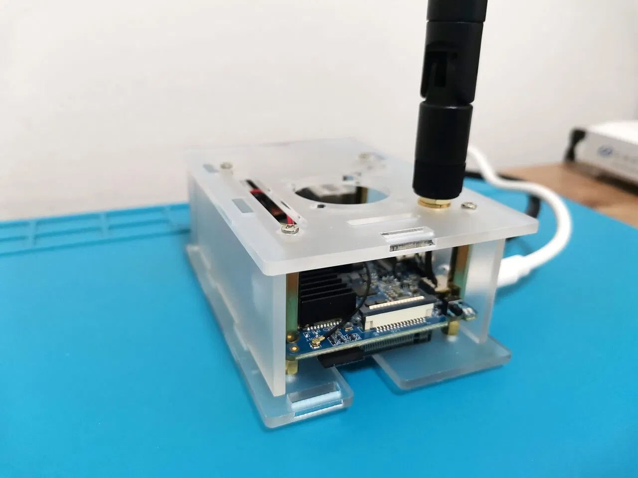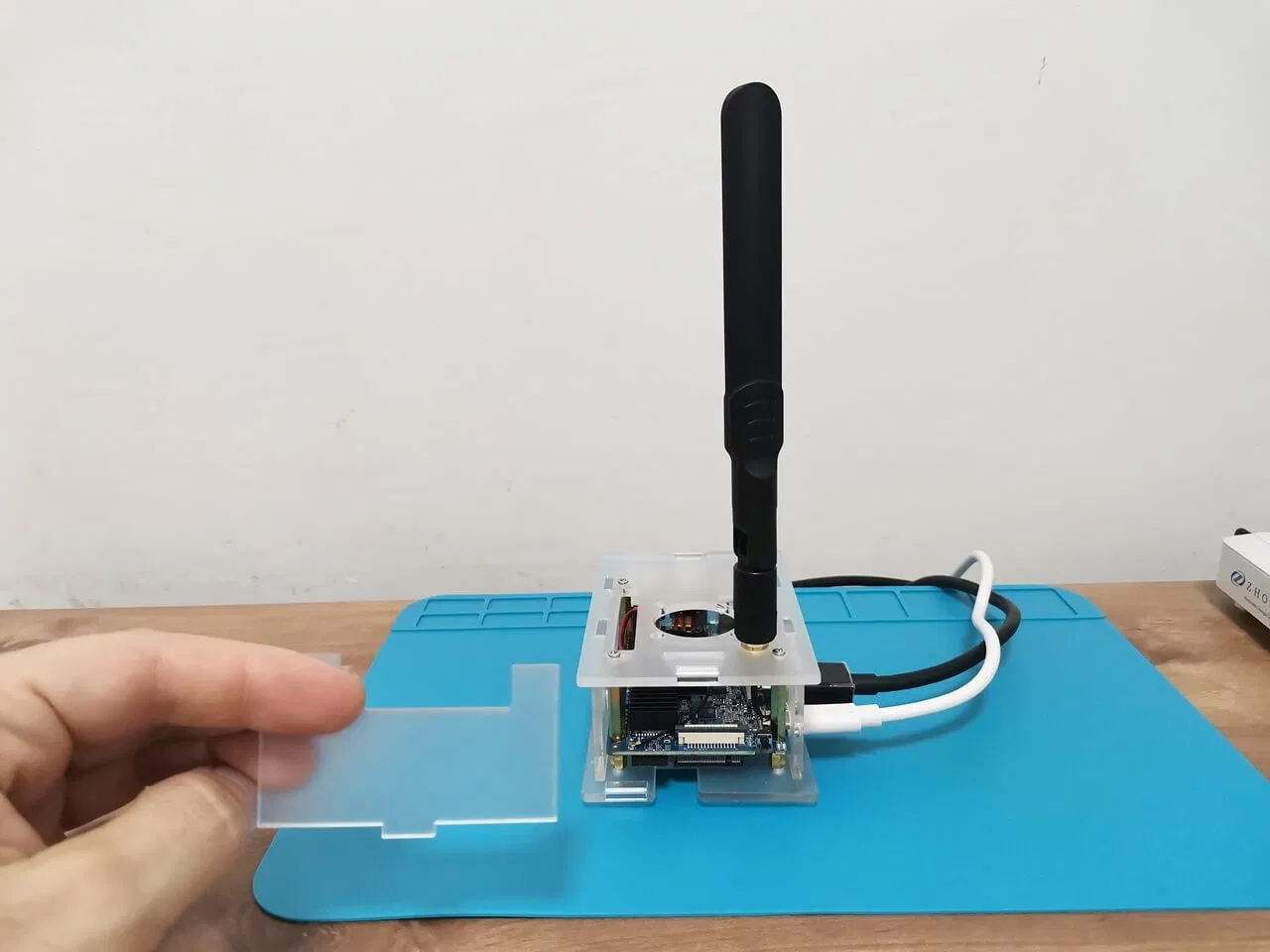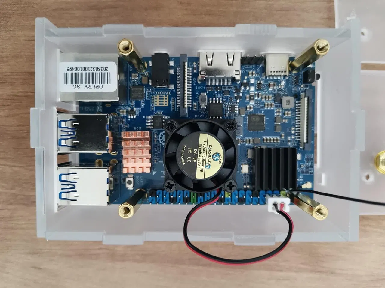 The RV board is being installed into a custom acrylic enclosure specifically crafted for the Orange Pi 4A board