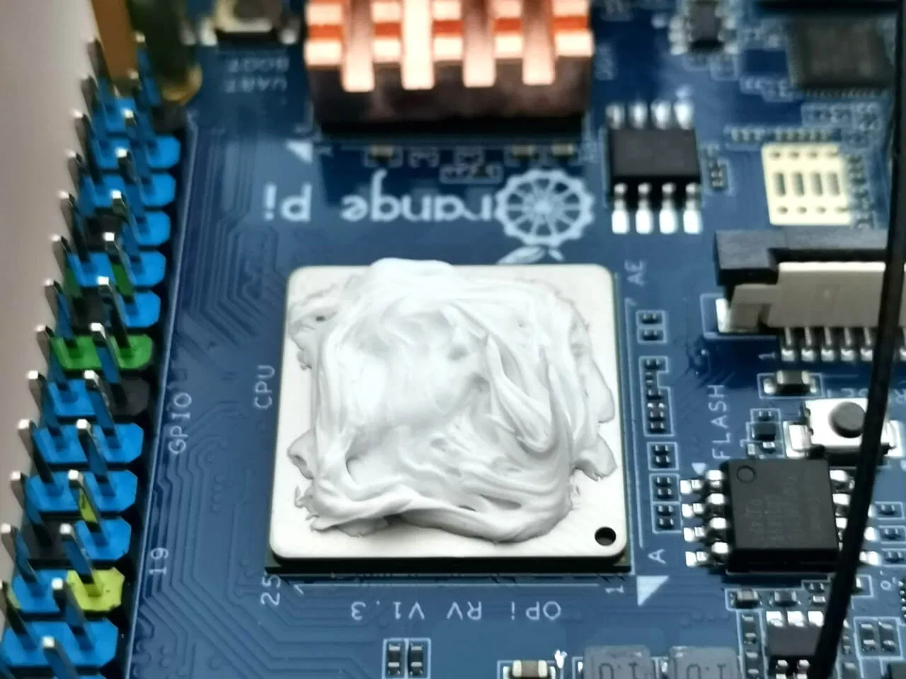 Due to the absence of mounting holes on the board, the optimal way to ensure maximum contact between the heatsink and the chip die is to utilize a thermal adhesive paste. We recommend applying a generous amount while exerting pressure in the center as you position it on the chip.