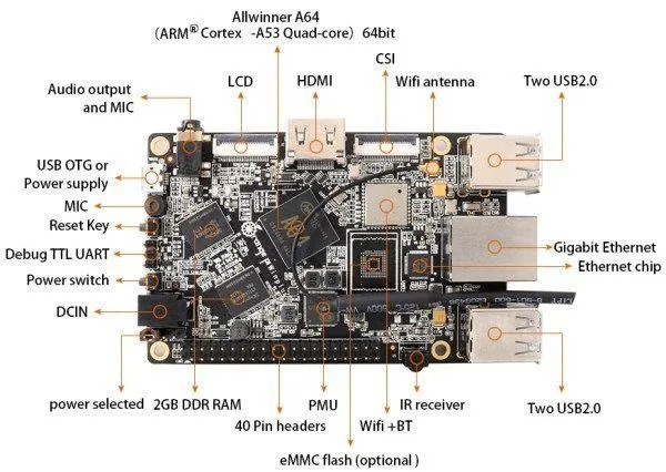 Orange Pi Win Plus is a Development Board and a single board computer based on the Allwinner A64 SoC, a successor of the previous Orange Pi Win with a few changes in the specification such as 2GB DDR3 RAM, External battery connector, and 2Mb Spi Flash. This new SoC offers an improved 64-bit quad-core predecessor with above decent performance for the Buck, along with a wide selection of interfaces for developers and hobbyists, such as LCD, HDMI, CSI, 40 Pins Header, Gigabit Ethernet LAN port, Four USB 2.0 Hosts, on-board WiFi with Bluetooth and more.