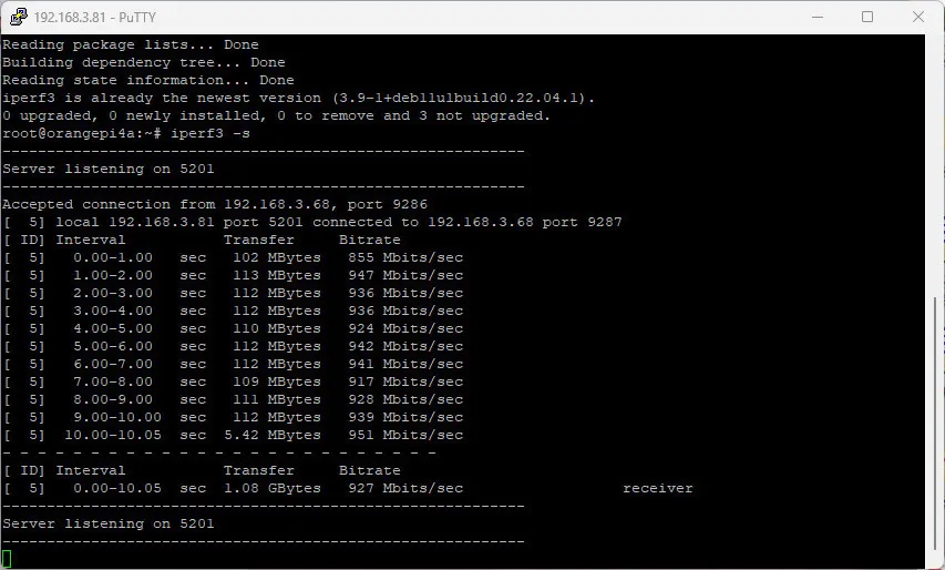 We thoroughly assessed the performance of the Orange Pi 4A, specifically examining its 1GbE LAN port using the perf3 speed test tool. This evaluation was conducted between our Windows 11 desktop PC and the 4A board, which served as the server endpoint. Both devices were linked through a high-quality Cat6 Ethernet LAN cable.