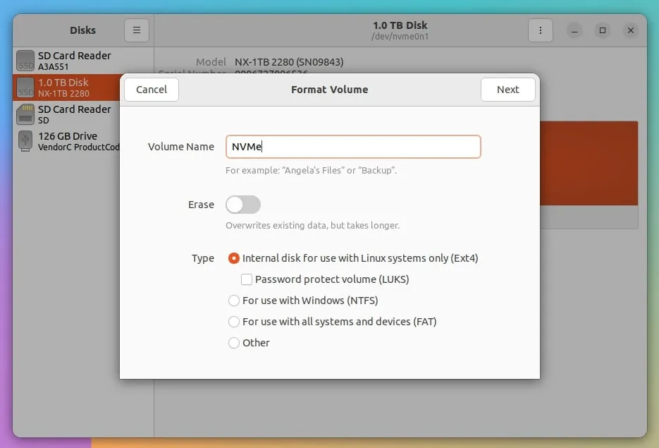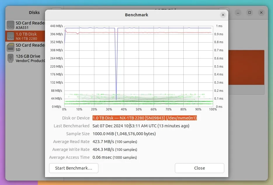 Testing a 1 TB NVMe using the GNOME Disk Benchmark tool.