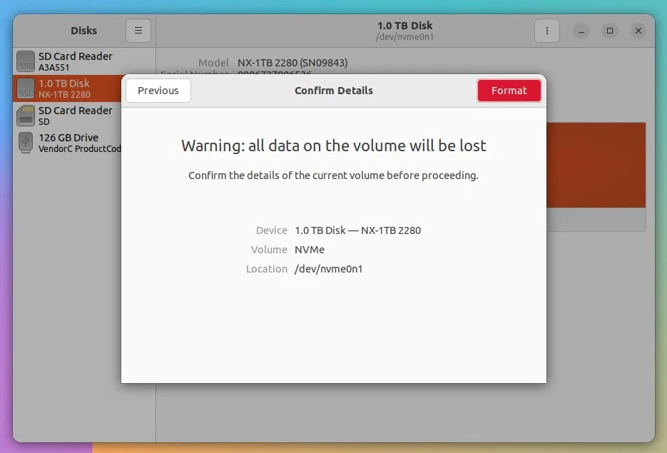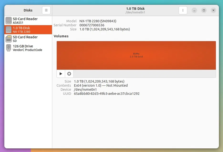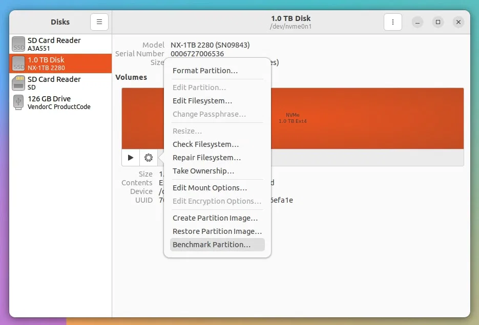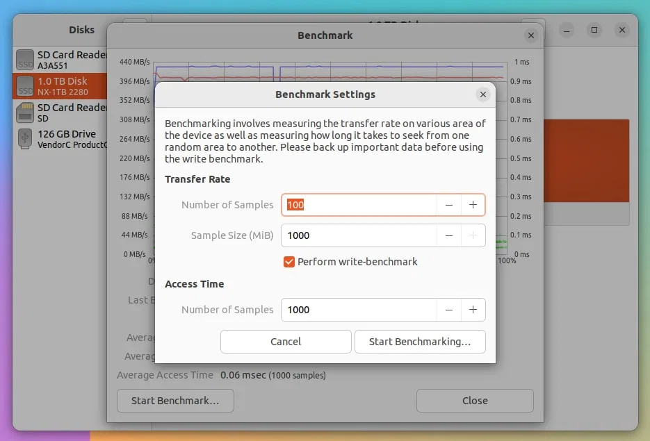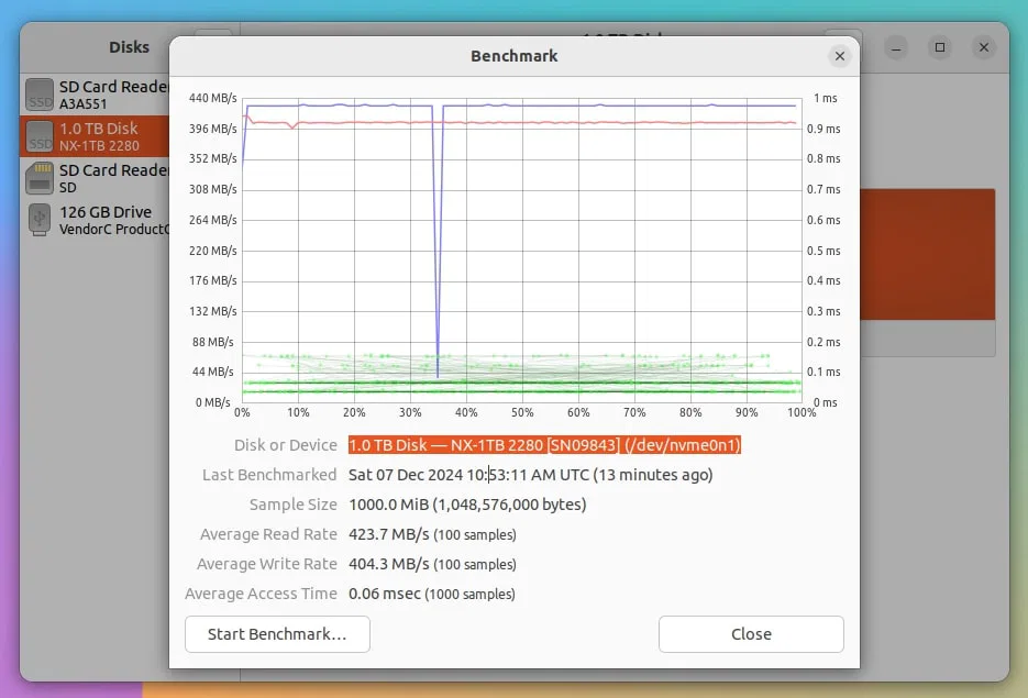 Testing a 1 TB NVMe using the GNOME Disk Benchmark tool.