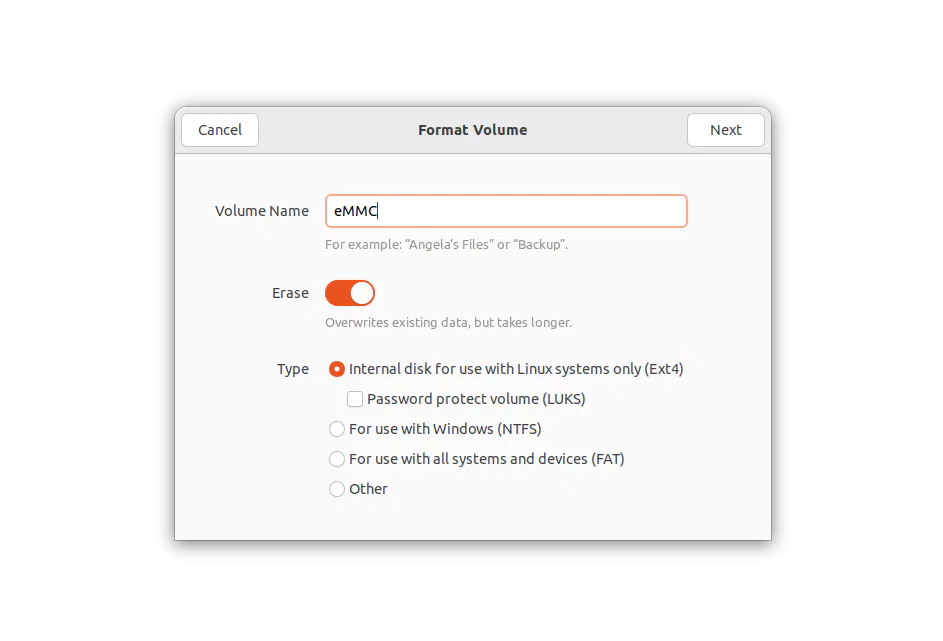 Evaluating the performance of an eMMC chip with the GNOME Disk Utility Benchmark tool.
