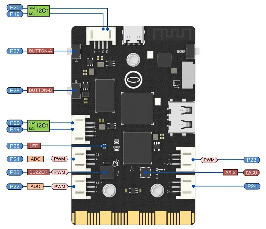 Gold Finger (Edge Connector) | Pin numbers are compatible with micro:bit, 19 independent I/O (Support 1 ×I2C, 1×UART, 2×SPI, 6×12-bit ADC, 5×10-bit PWM) |