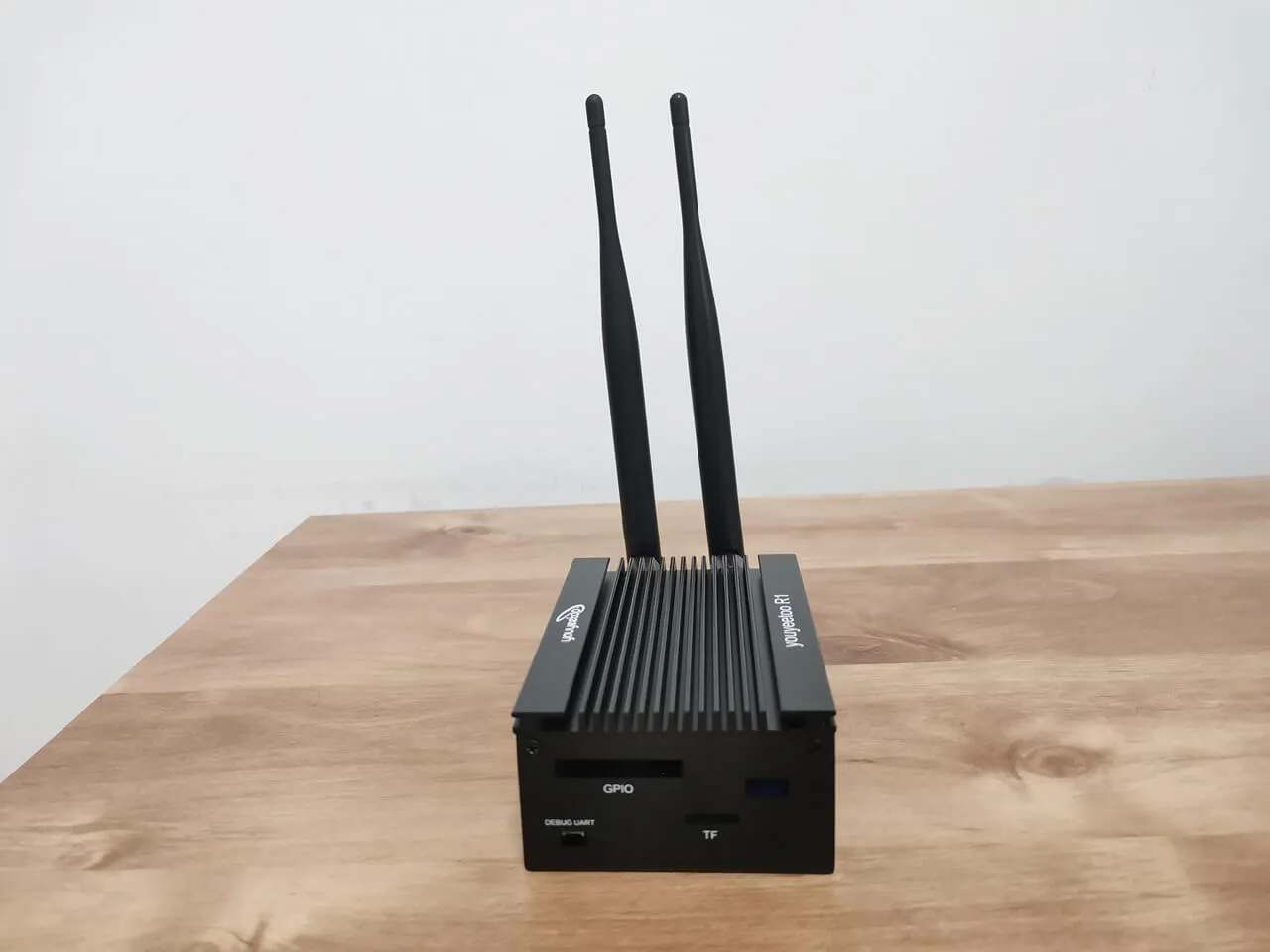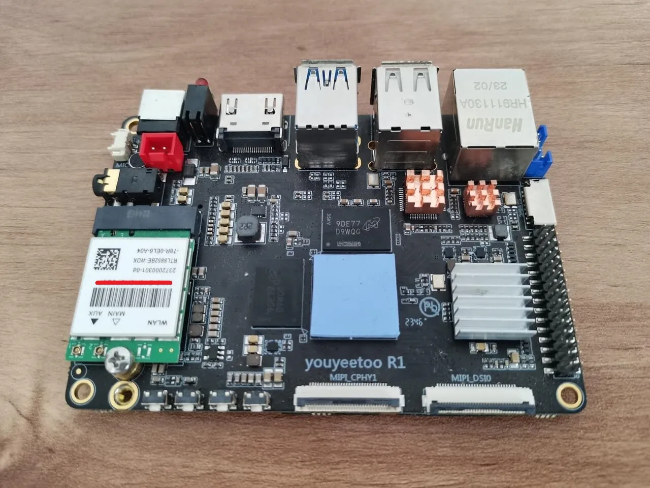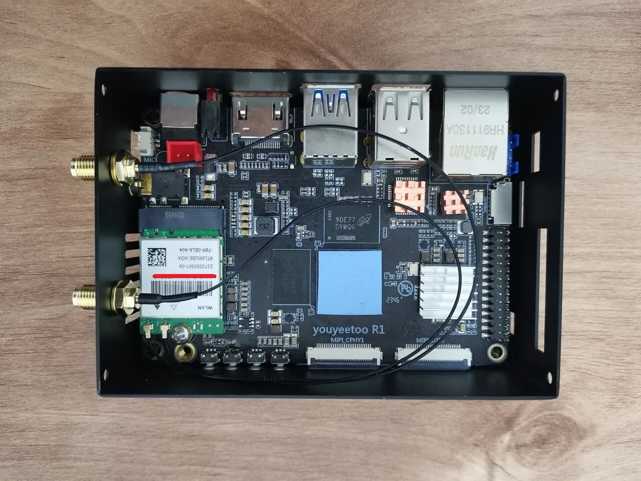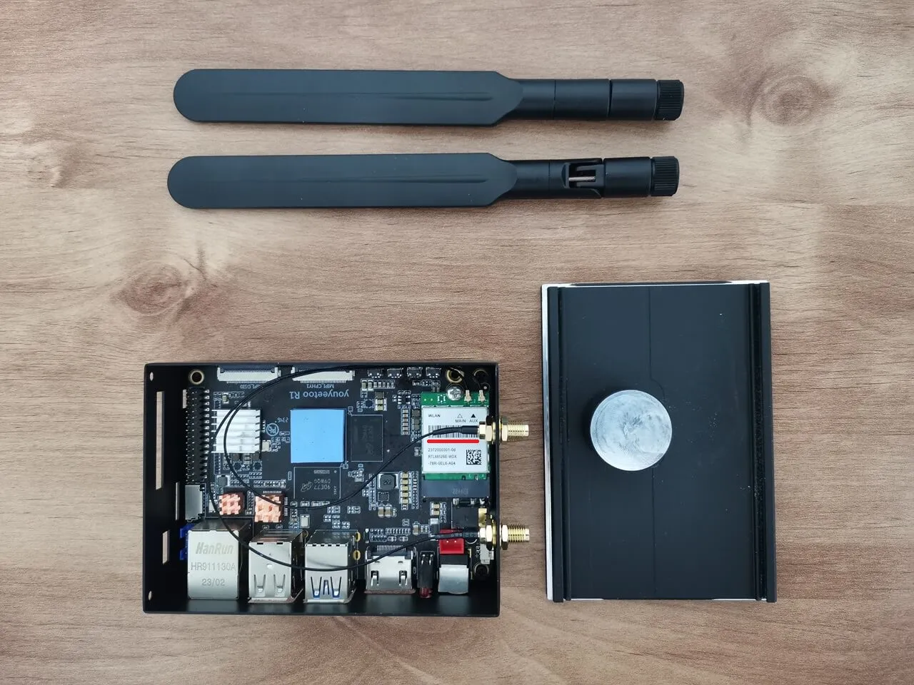 The final outcome, illustrated in the photos below, exceeds all expectations, showcasing a well-crafted metal enclosure. For those interested, the Wi-Fi card and antennas can be purchased separately on the YouYouToo website. Furthermore, the images reveal that we have incorporated additional heat sinks onto the eMMC flash chip, USB controller, and Ethernet controller to improve cooling performance.