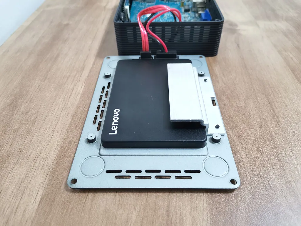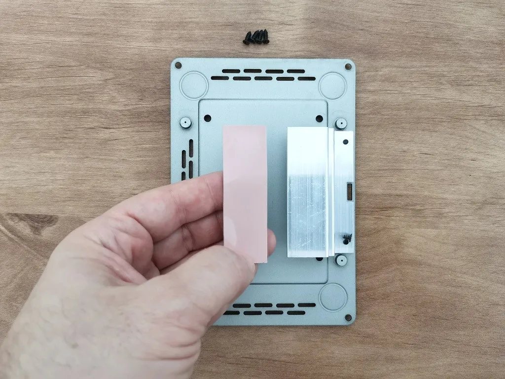 MeLE company design also includes an L-shaped profile connected to the cover with a set of screws. In addition, MeLE added a thermal pad in the package to improve thermal contact between the cover surface and the SSD card. And finally, solely for general experimentation purposes, you can find a suitable thermal pad on AliExpress according to the drive dimensions to use with the full-size 2.5 Inch SSD.